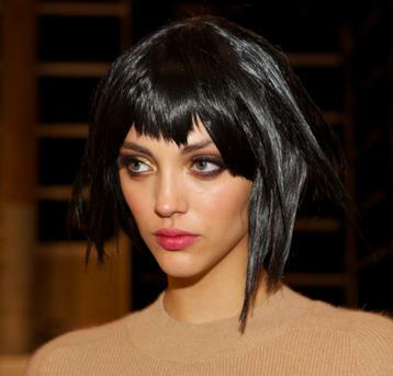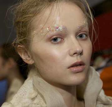 Hair style: "Kate's show today is all about Romeo and Juliette - but not the classic tale, more like Baz Luhrmann's Romeo and Juliette. They're very beautiful and youthful but are cool rock and roll kids. There's two looks - a Romeo and a Juliette. We've got some of our girls being girls and some being boys. The Juliettes are very feminine, the hair is being prepped with a bristle brush and Diamond Oil. It's being blowdried and polished and then we're working with a large curling iron to put the subtletest of bends into the hair. It's a centre parting and then it's twisted back and secured at the back of the head with a cross shape with two pins. That cross motif is running all the way through from the hair, to the make-up, set and the clothes. The Juliette look is very soft, whimsical and romantic. Our Romeos are much tougher, they're rock and roll. The hair has been prepped with Diamond Oil and blowdried into a beautiful condition - so it's all about the luxury. We're then taking some Rough Paste and are just pushing the hair back off the face as if a dude with slightly long hair got some hair oil and ran his hands through his hair - so he feels cool and tough and effortless but still luxurious," says Richard Kavanagh.