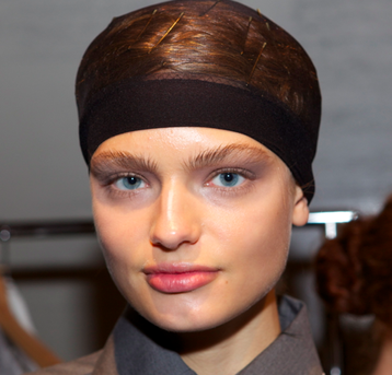 Hair style: "We're creating a strong, sporty, sweaty-looking ponytail, which is a little more graphic and less romantic than Akira's normal styling. We're making the hair look stronger and less romantic by adding wetness. We apply the product through the hair and then use the hairdryer and hands to naturally create texture. There's two sections of the girls in the show, one which is quite sporting in the styling to go with the bold-coloured clothing, and then there's a section of angels that come out that are wearing soft skin-tone clothes with sheer light fabrics that I've given a graphic, modern, aerodynamic chignon. I wanted to keep the texture the same so they both have wet texture to the hair. Key products are Wella Perfect Setting and Wella Hydrate Milk. We're using the Hydrate Milk to create the sweaty look so it leaves the hair soft and hydrated but it doesn't look greasy," says Travis Balcke.