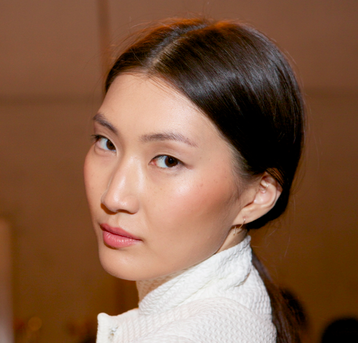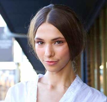 Make-up style: "We've gone with really clean skin, really mattified, but we've used a glowy product on the base so they've still got radiance. We've used our CC cream that colour corrects your skin tone as well as capturing the light. We've made the skin perfect and then we've mattified it with our Matte Bronzer, so we've still got radiance but we've set the powder and given warmth. We have a nude lip with our Velvet Lipliner, we've lined the lip with that, and we've finished off with our Go Nude Lipstick. Strong brows and a winged liner complete the look. Really wearable and really fresh," says Victoria Curtis.