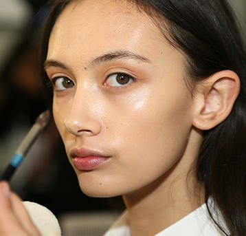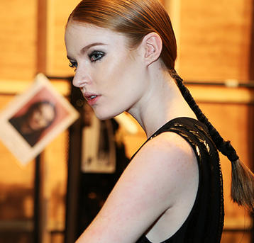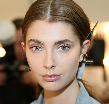Make-up look: “Rebecca Vallance wanted the make-up to be slightly Palm Springs - so it has that resort feel to it. It's very creamy and very fresh, with the models looking healthy. Some of the girls are having a red lip, and some aren't. We've got a highlight going on using the Lustre Drops in Pink Rebel mixed with Cream Colour Base that gives a golden glow to the skin. That is used on the high planes of the face - so on the cheekbones, down the centre, down the nose, down the cupid's bow. On the eyes, we're using a couple of shades from the M.A.C Trend Forecast Fall 16 Eye Palette. Brows, we've got the Big Brow Pencil brushed slightly through the brow, and then we're brushing them up with Clear Brow Set to keep them in place and lift up the brow - it's not overly drawn on."