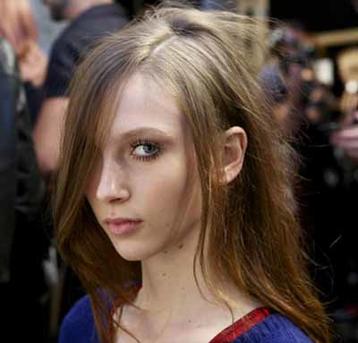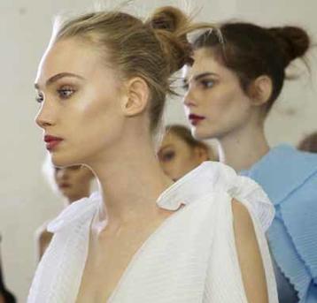 Hair style: "The look today is strong with an artisan feel. We want to give a furturistic element, while still keeping it a bit natural. We've applied Redken Stand Tough Gel to the roots of dry hair and left the ends and mid-lengths natural with a bit of texture. To start we took the part lines and applied the gel, combing it down and bringing the hair forward to form two waves. Majority of the hair is left tucked behind the ears, with just a few strands in front. We've only combed the gel through the top of the hair, leaving the rest natural," says Jon Pulitano.