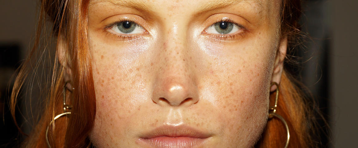 “Today for Deadly Ponies we’re going for shiny, happy, hippy, cult. All the models are related, and it’s the summer so they’ve seen too much sun. We’re creating characters in a cult today instead of a full beauty, glamorous look. Throughout we have really beautiful ochre tones and bronzed tones; and I’m starting by drawing freckles on the models with our lip liner pencil where they would actually get freckles. The pencils we’re using are Stone and Cork. Another important part of the character is bigg, bushy brows that we want to look like they’ve never been touched by tweezers. To do this we’re using the M.A.C Brow Pens where we can create individual hairs. No mascara on the eyes, we’re just doing a halo effect with eyeshadow and then talking the Prep and Prime Bright Forecast Highlighter and placing it in the corner of the eyes.”