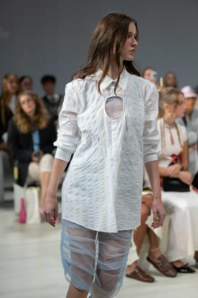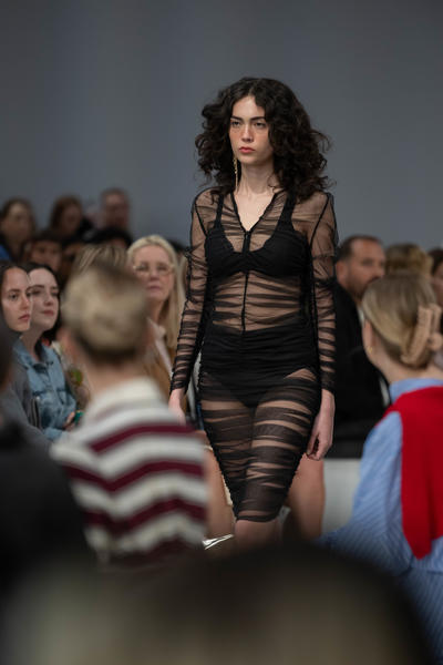 AERIS was defined by ethereal layering, subtle contrasts, and fluid tailoring. Printed Trompe L’oeil denim illusions appeared across dresses, skirts, and tops, layered over sheer fabrics to create visual intrigue and dimension. Lace body-con pieces were layered under and over structured garments, adding texture and cohesion while creating visual lightness and fluidity.