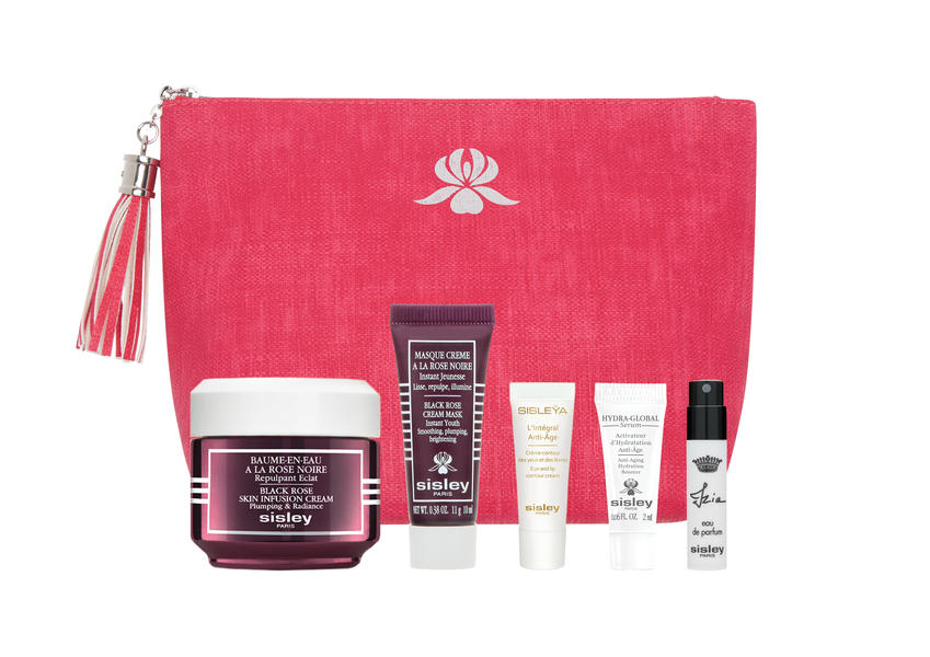 Sisley Paris Black Rose Skin Infusion Cream Set is a gift pack for Mother's Day. It includes Black Rose Skin Infusion Cream (50mL), Black Rose Cream Mask (10mL), L’Integral Eye & Lip Cream (2mL), Hydra-Global Serum (2mL), Izia EDP (1.4mL) and Beauty Bag.