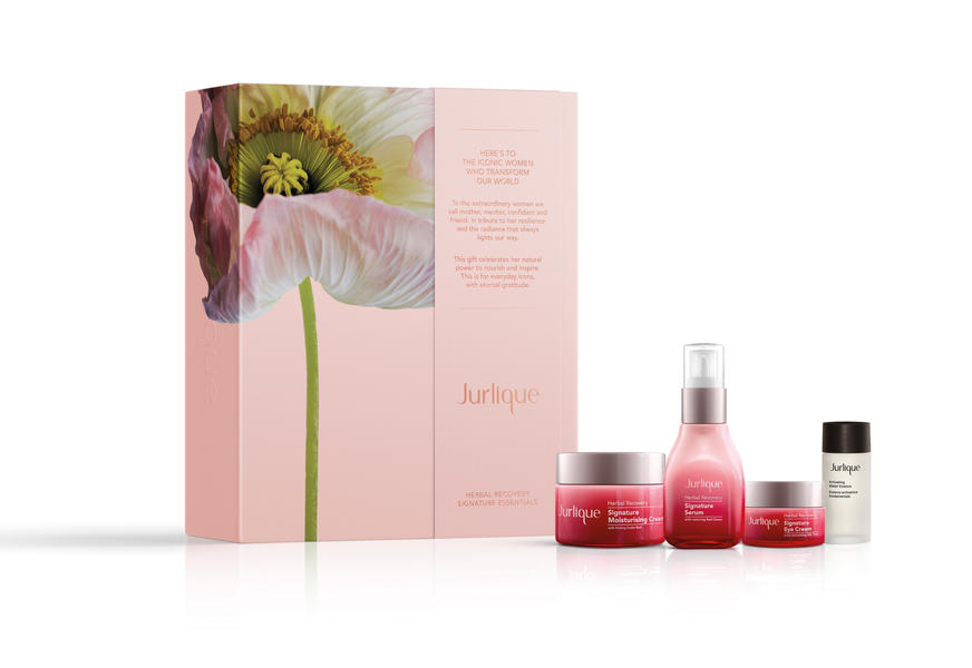 Jurlique Herbal Recovery Signature Essentials is a gift set for Mother's Day, featuring high performance products with powerful botanicals to combat fine lines and dull skin. The set includes Herbal Recovery Signature Serum (30mL), Activating Water Essence (10mL), Herbal Recovery Signature Moisturising Cream (50mL) and Herbal Recovery Signature Eye Cream (15mL).