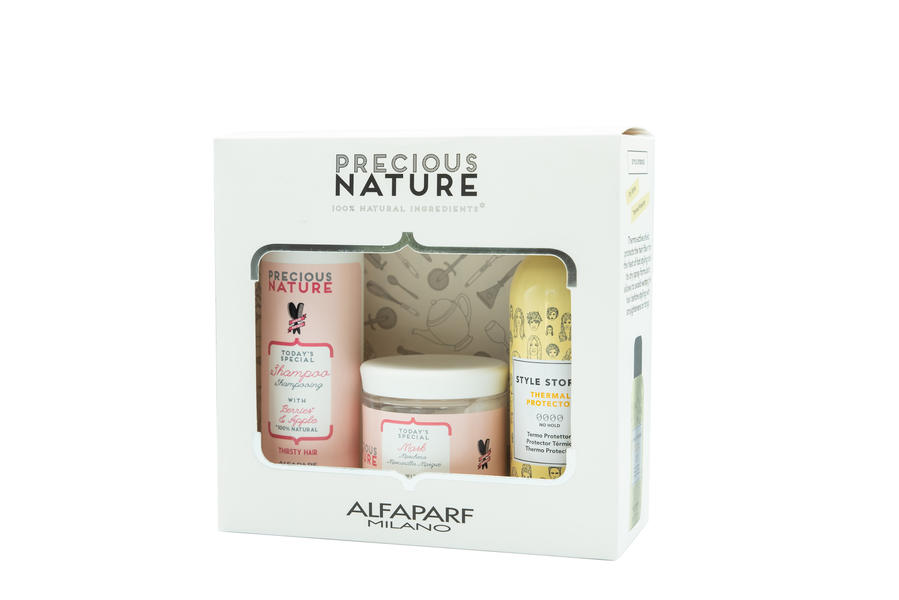Alfaparf Milano Precious Nature Trio For Thirsty Hair is a limited-edition gift pack part of the Mother’s Day 2019 Collection. The pack includes Precious Nature For Dry and Thirsty Hair Shampoo, Precious Nature For Dry and Thirsty Hair Mask and Style Stories Thermal Protector.