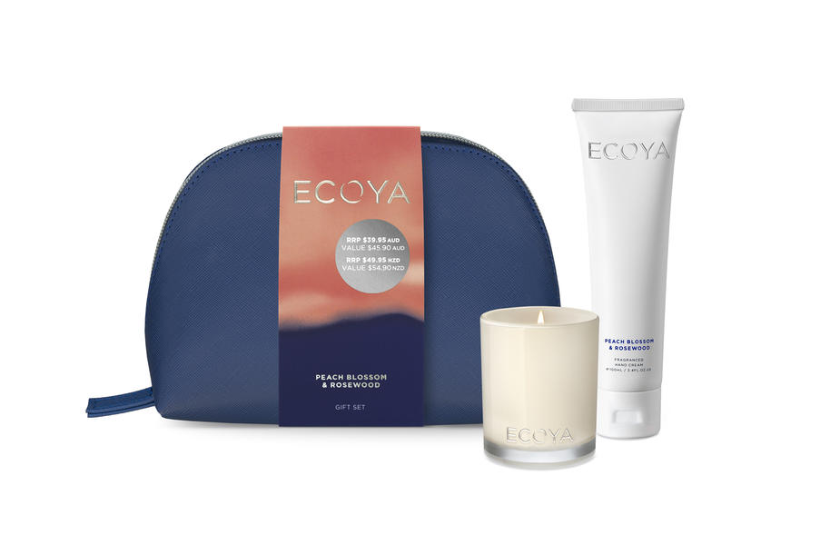 ECOYA Peach Blossom & Rosewood Gift Set is a limited-edition gift set for Mother’s Day. The set includes a limited-edition branded cosmetic bag, Mini Madison Candle and Hand Cream, both fragranced with Peach Blossom & Rosewood.