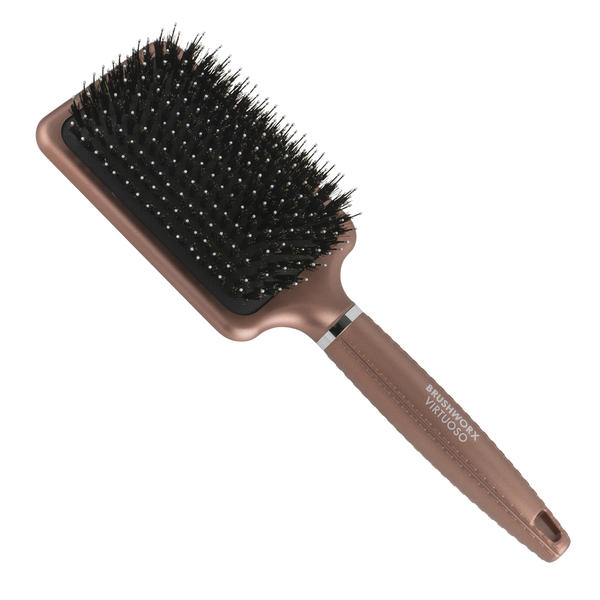 Brushworx Virtuoso Paddle Brush Mixed Bristle is a paddle brush that smooths, straightens and detangles all hair types. Nylon bristles gently detangle while 100 per cent boar bristles help to condition hair by distributing the scalp’s own oils.