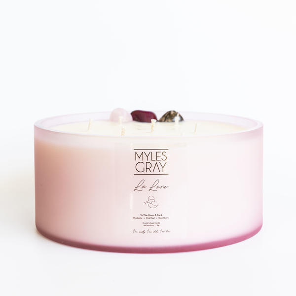 MYLES GRAY La Lune Candle is an ode to love, with a vibrant watermelon scent and 7 wicks. Infused with rose quartz, rhodonite and pink opal, this luxurious take on crystal healing will create a calm and warm space in your home. La Lune is a physical representation that you mean so much to someone, that they love you to the moon.