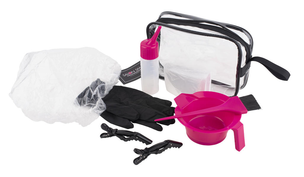 Salon Smart Hair Colourist Kit Pink is an eight-piece collection of convenient, portable colouring tools and accessories. Kit includes: tint bowl, large tint brush, applicator bottle, medium latex gloves, crocodile clips, disposable cape, disposable cap and zippered bag.