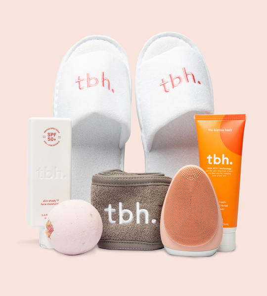 tbh Skincare to me, from me bundle is a limited-edition gift set for Valentine’ Day. It includes: 1 x gentle cleanser, 1 x face brush, 1 x skin shady 50+, 1 x headband, FREE tbh slippers and FREE Australian handmade bath bomb.