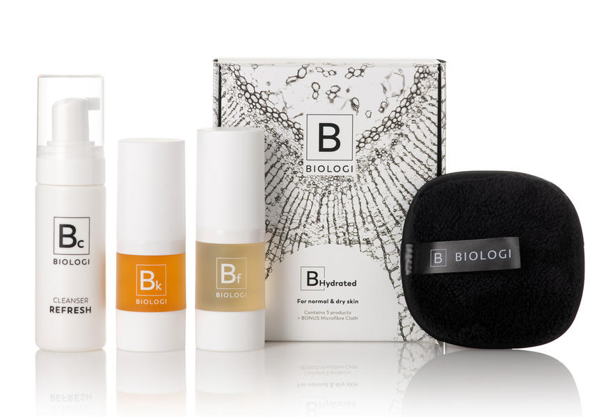Biologi BHydrated Skin Bundle is a skincare pack perfect for normal to dry skin types. The pack contains: Bc Refresh Cleanser, Bf Restore Face and Body Serum, Bk Eye Rejuvenation Serum and a bonus Biologi Microfibre Cloth.