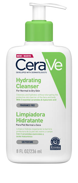 CeraVe Hydrating Cleanser is a cleanser developed with dermatologists to cleanse and refresh the skin without over-stripping it or leaving it feeling tight and dry. It features three types of essential ceramides to restore the skin’s natural barrier and hydrating hyaluronic acid.