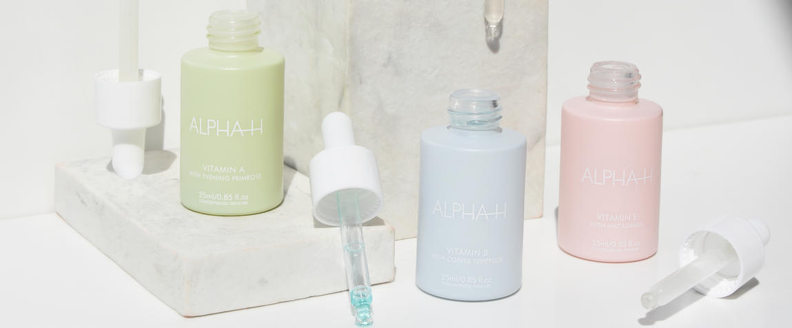 Alpha-H Vitamin Serum Kit - This beautiful bespoke kit contains each of Alpha-H’s four Vitamin serums. It includes all the products needed to provide skin with the antioxidant support it needs at any time. Includes: Vitamin A, B, C and E, each housed in dreamy pastel glass bottles.
