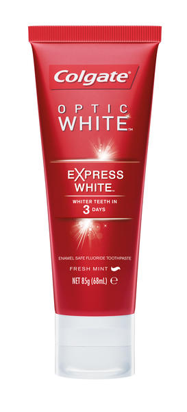 Colgate Optic White Express White is a toothpaste that works to whiten teeth in three days. The toothpaste contains twice the whitening ingredient as other Colgate whitening products, and goes beyond surface stain removal to help prevent stains from coming back.