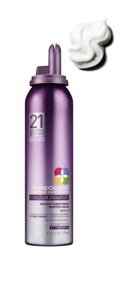 Pureology Colour Fanatic Instant Conditioning Whipped Cream is a treatment formulated for fine, colour-treated hair. Featuring aerosol packaging with a star-tip dispenser that creates a whipped cream texture, the treatment provides immediate and visible results without compromising volume and movement or weighing the hair down.