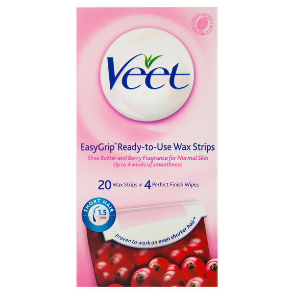 Veet EasyGrip™ Ready to Use Wax Strips are developed for normal skin. The strips come with a new grip tab to help perfect the waxing technique. The shape of the strips make waxing easy as the grip tab highlights the right area to remove the strip and offers additional room for a more precise hold.