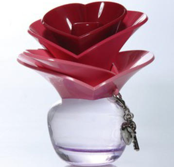 Housed in a heart-shaped bottle wrapped in gold lacing, the fragrance is described as flirty sophistication”.