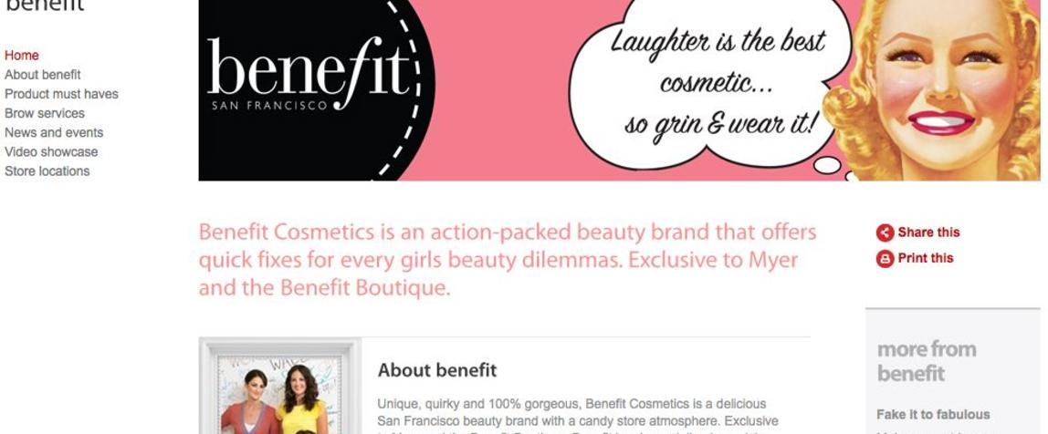 is expanding its online presence with the launch of Benefit Beauty World. Hosted by Myer, the new microsite allows consumers to shop online, plus they can access Benefit news and product information, a menu of beauty services available at Benefit’s brow bars and a video showcase of products. You can check out the new site at www.myer.com.au/benefit.