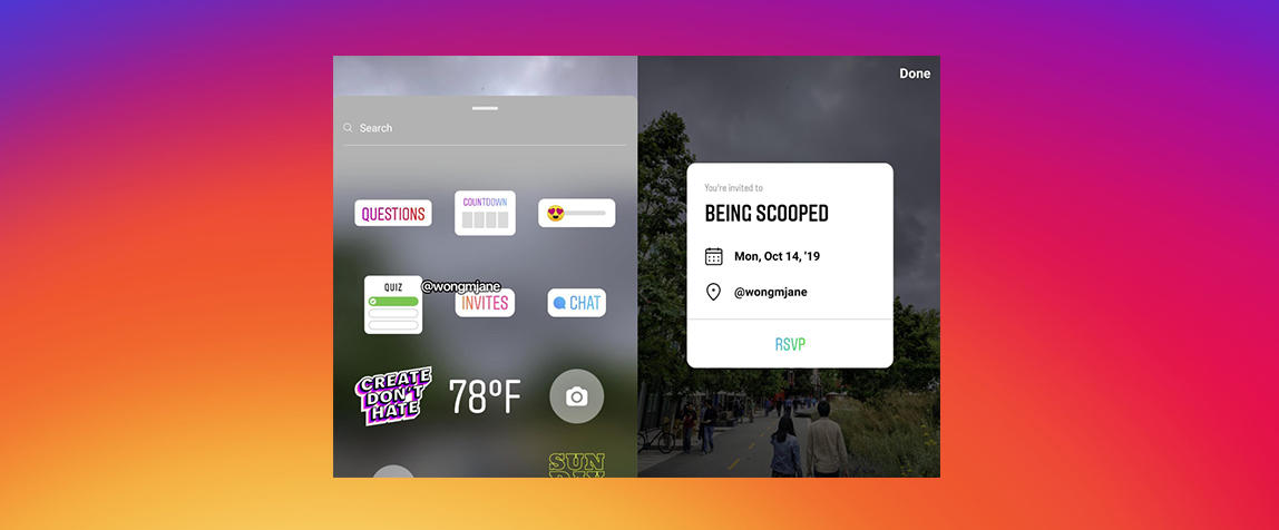 This time, it's a special 'Invites' sticker that can be used in Stories to share events with followers and let them RSVP directly in the app. The feature includes an event title, date and location, alongside the RSVP button, and would mirror the existing Countdown and Poll stickers.