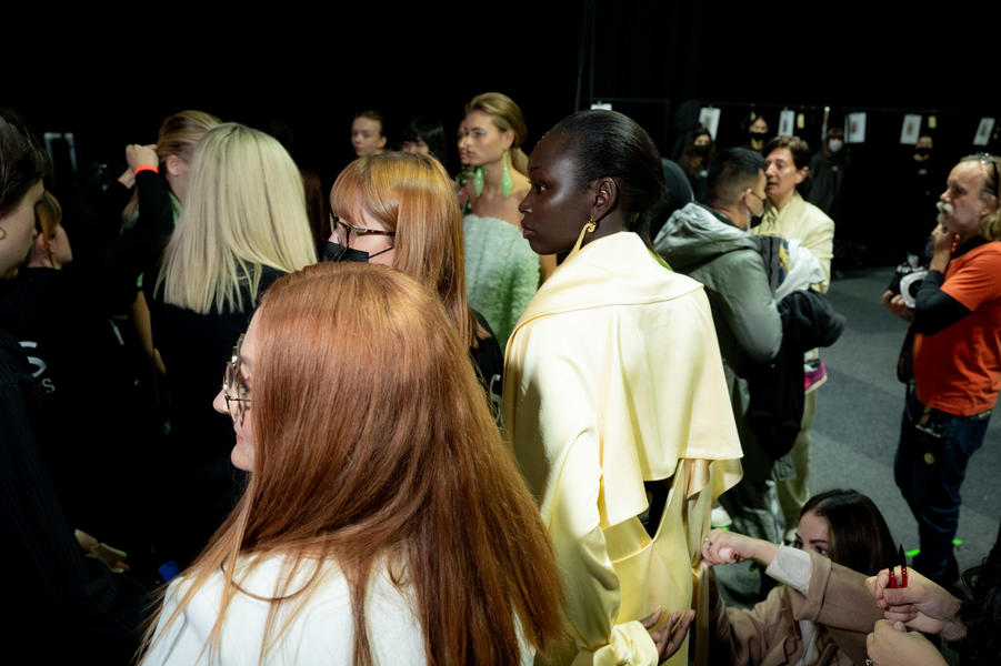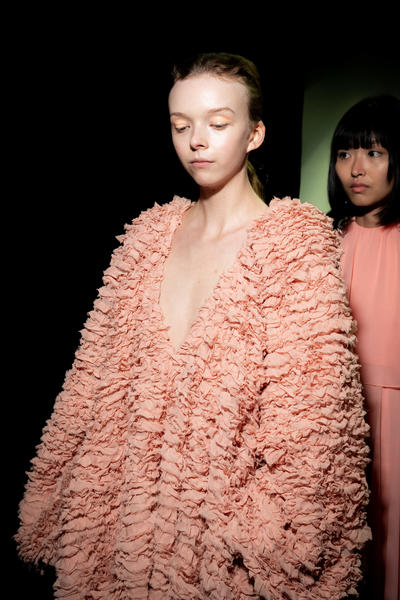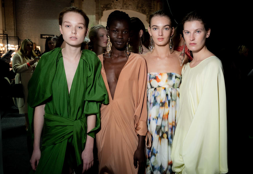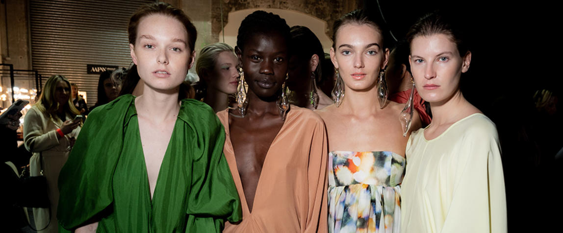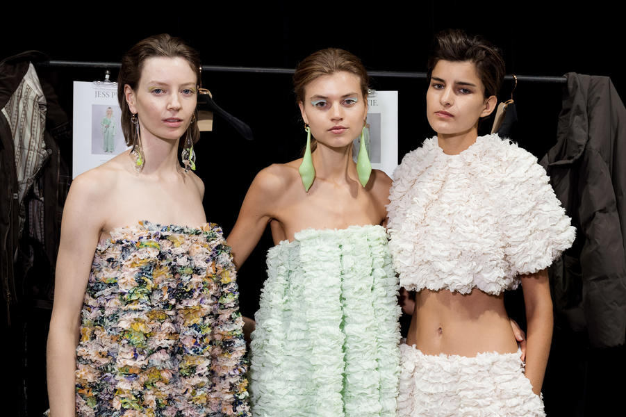 We’ve used paint across the eye and really customised and mixed the perfect shade for each person. So green garments with green paint on the eyes etc. The girls who aren’t wearing certain eyes have glossy eyes."