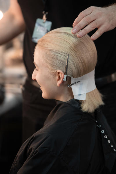 6. Add middle section, making sure the gradient of hair above the ear is horizontal. Secure with KMS HAIRSTAY Working Hair Spray.