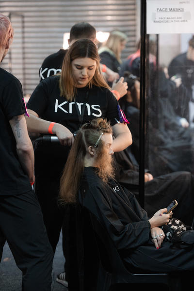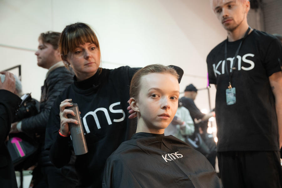 1. Apply KMS ADDVOLUME Styling Foam Mousse on mid lengths, particularly targeting sides. If your hair is a silkier texture, use KMS HAIRPLAY Sea Salt Spray. Girls with short hair should use KMS HAIRPLAY Hybrid Clay Wax.