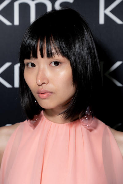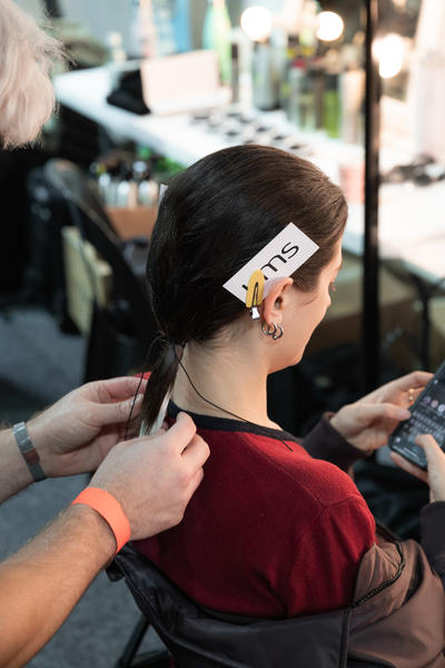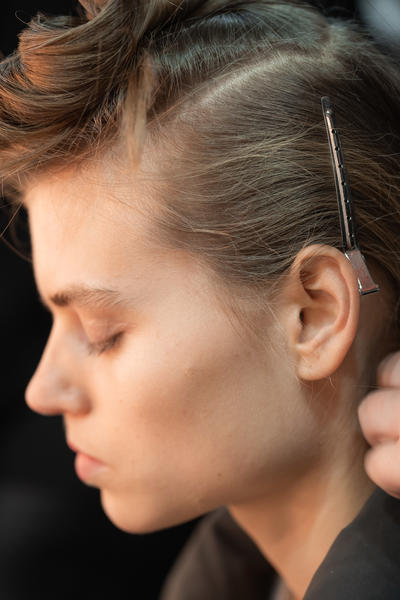 "It's super feminine. The idea is that she’s brushed it back herself so it’s textured. You can see finger marks in the hair, so it’s got that soft femininity to it, but there’s a real modern edge too because it’s coming at a horizontal line, and then down at the lower nape it's really trying to get the ponytail skinny."