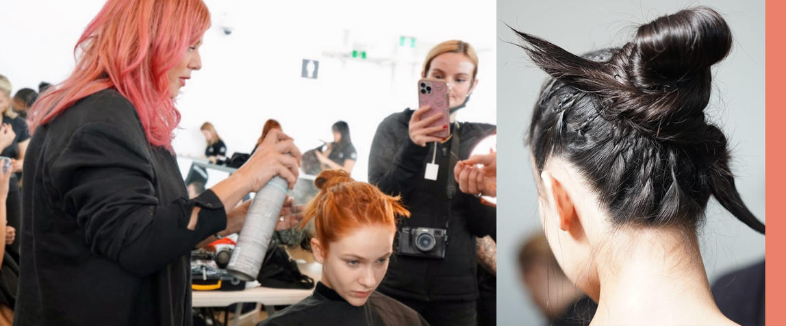 "It's all about creating beautiful texture, which we did by plaiting and braiding. The bun itself is twisted with pokey detailing on the ends, which is very big at the moment."