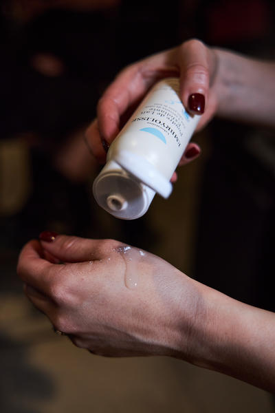 Step 5. Apply a generous amount of Lait-Crème Concentre to the entire face to prime the skin and add a touch of Cicalisse Cream to the cheeks for an extra- glossy look.