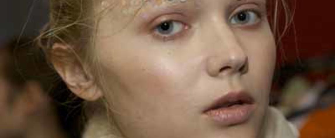 Hair style: "We're creating a strong, sporty, sweaty-looking ponytail, which is a little more graphic and less romantic than Akira's normal styling. We're making the hair look stronger and less romantic by adding wetness. We apply the product through the hair and then use the hairdryer and hands to naturally create texture. There's two sections of the girls in the show, one which is quite sporting in the styling to go with the bold-coloured clothing, and then there's a section of angels that come out that are wearing soft skin-tone clothes with sheer light fabrics that I've given a graphic, modern, aerodynamic chignon. I wanted to keep the texture the same so they both have wet texture to the hair. Key products are Wella Perfect Setting and Wella Hydrate Milk. We're using the Hydrate Milk to create the sweaty look so it leaves the hair soft and hydrated but it doesn't look greasy," says Travis Balcke.