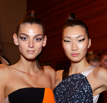 Skin prep: "Most of the girls come with make up on from other shows, so what we do is apply some cleanser and water spray, and then remove it all using the Clarisonic. It has a timer that tells you when to move from one section of the face to another, and completely cleans the face in 60 seconds," says Jade Stanley.