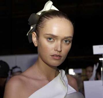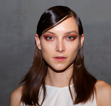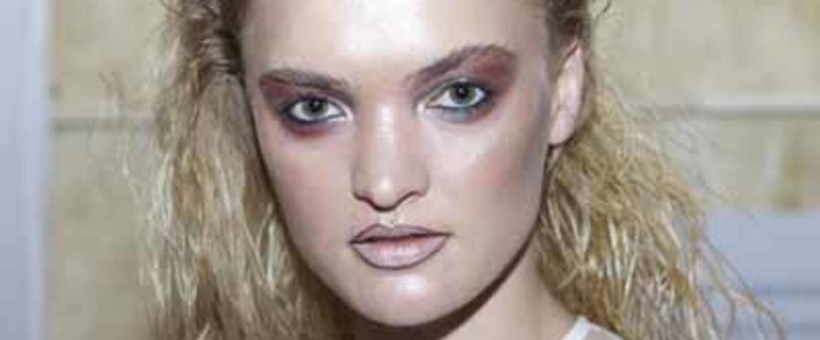 Make-up style: "Today we have taken inspiration from the 90s and the grunge look. We want it to look a bit like it's the morning after a big night, as though it's a bit worn. The eyes are adorned with a beetle shade that's multi-coloured, with green flecks. It's only the shadow on the eyes, no masacra. We want all of focus on the colour. It's a new take on the bronze smoky eye. We've kept the skin really fresh and dewy, but not perfect - we want it a bit undone and bold. The lips will then have a 90s fill, using deep lip liner, applied quite intensely around the edges and then left as is. The cheeks are quite structured and contoured, with highlighter perfecting that dewy look," says Mikele Simone.