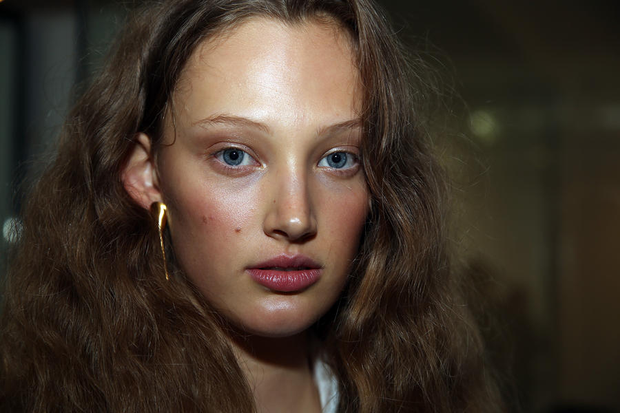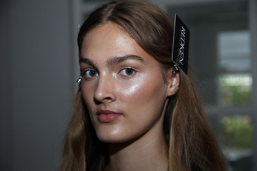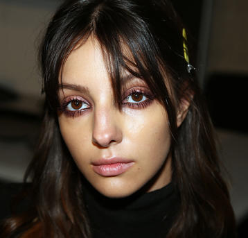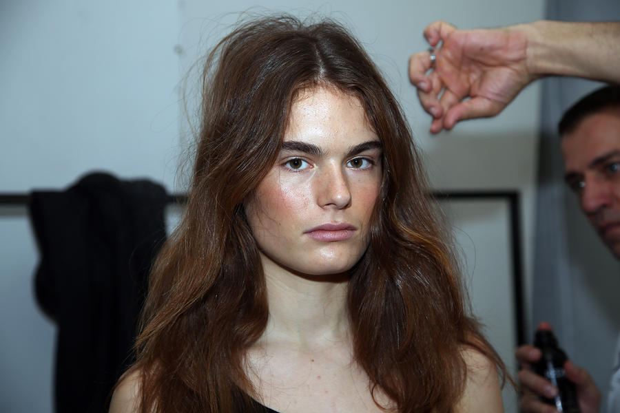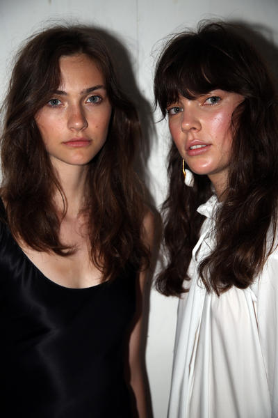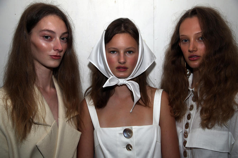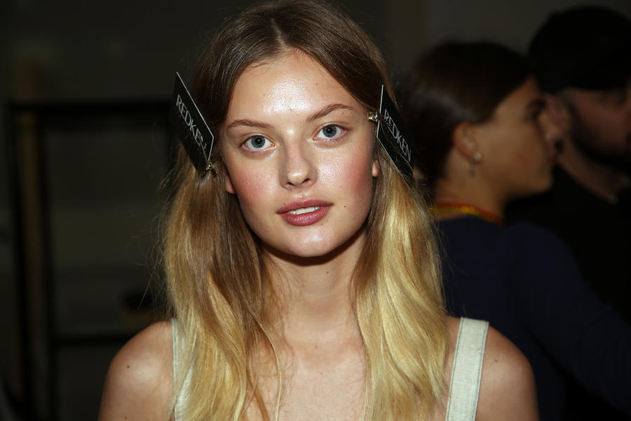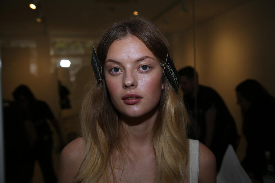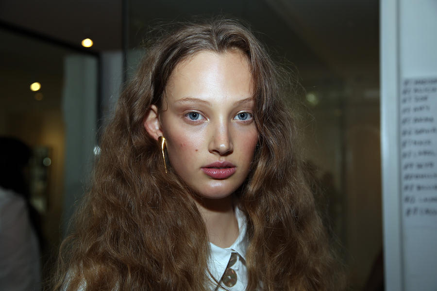 "The look is really youthful and ethereal. Marina [Afonina] wanted to transport everyone to this beautiful place in Italy where girls are just picking lemons; it’s a really organic collection using a lot of linens and shells so we wanted to keep the look organic too. The look was started with slightly dampened hair and a bit of Redken Rootful - that is a dry, powdery, body-building spray that also gives a little bit of grip, which is going to help us with all the flyaways. Then we used a flat iron to create flat iron curls, not actually rounded curls. This flattened texture keeps it a bit raw, and not beautiful in terms of big rounded curls. Once that’s done we used Windblown by Redken; that’s a really light hairspray with a dry shampoo. Spray heaps of that in. We brushed it all out and ruffled it all in with our fingers so we’re not getting that, sort of beachy curl, it’s a bit more brushed out and ethereal. Then we finished that off with a bit of Fashion Work 12 on the front.”