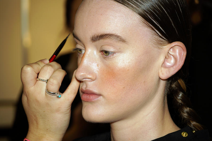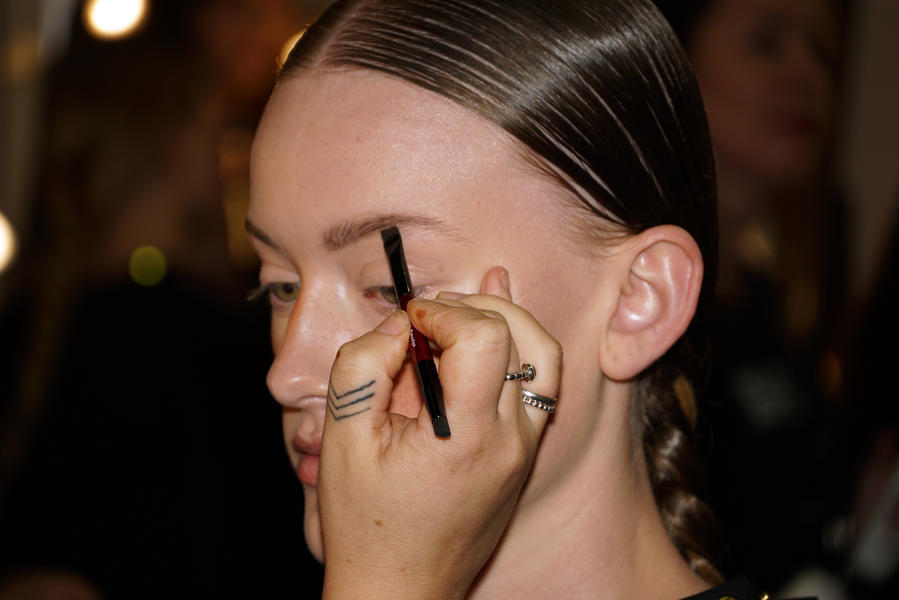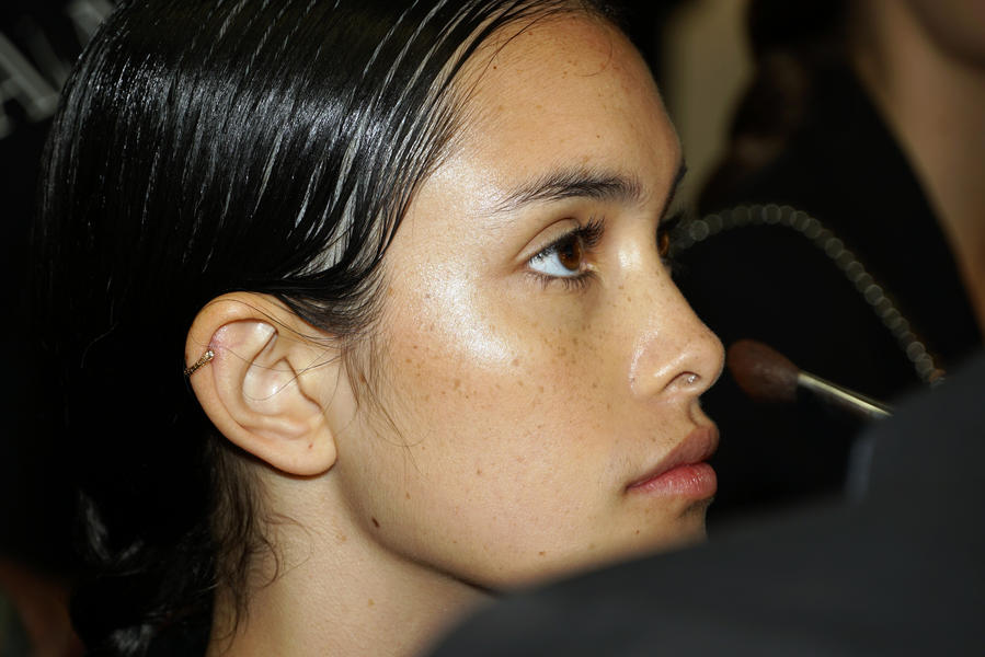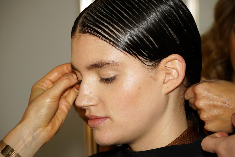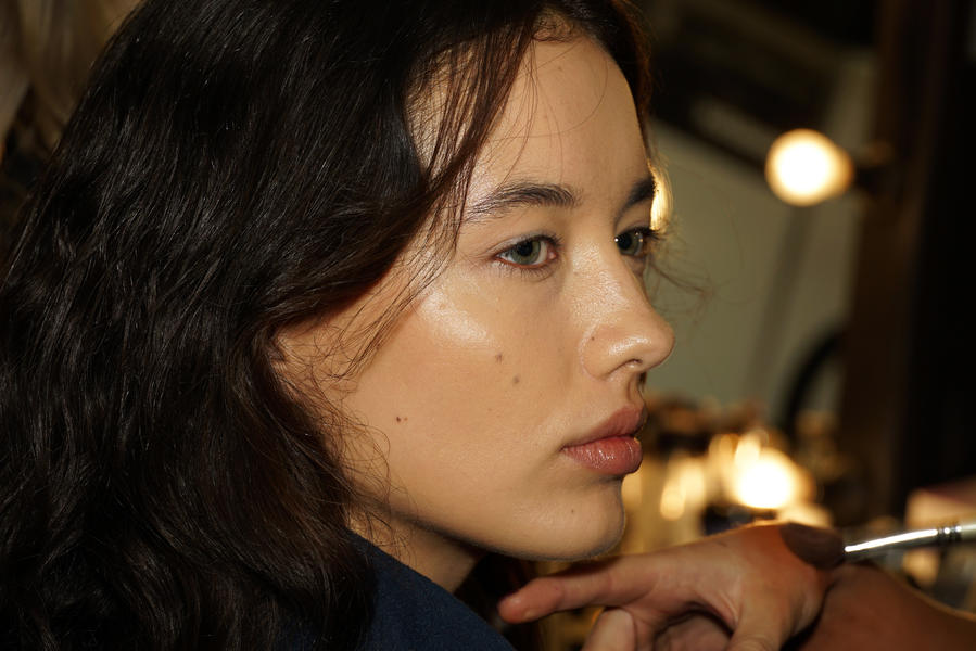 "The inspiration I was given was a strong, confident, feminine look; but to also be quite unisex. We wanted femininity and masculinity so you will see that there's two looks. All the models have radiant skin as we've done our signature skin look – called the Parisienne Glow. For that use our iconic product Lancôme Advanced Génifique with a device that helps the product penetrate deeper into the skin and capture luminosity. Minimal foundation was used, but we used our Teint Idole Ultra Wear foundation mixed with Teint Idole Ultra Wear Custom Glow Drops to create a dewiness and the illusion of a second skin by thinning out the texture. The glow drops are also used to highlight the skin.