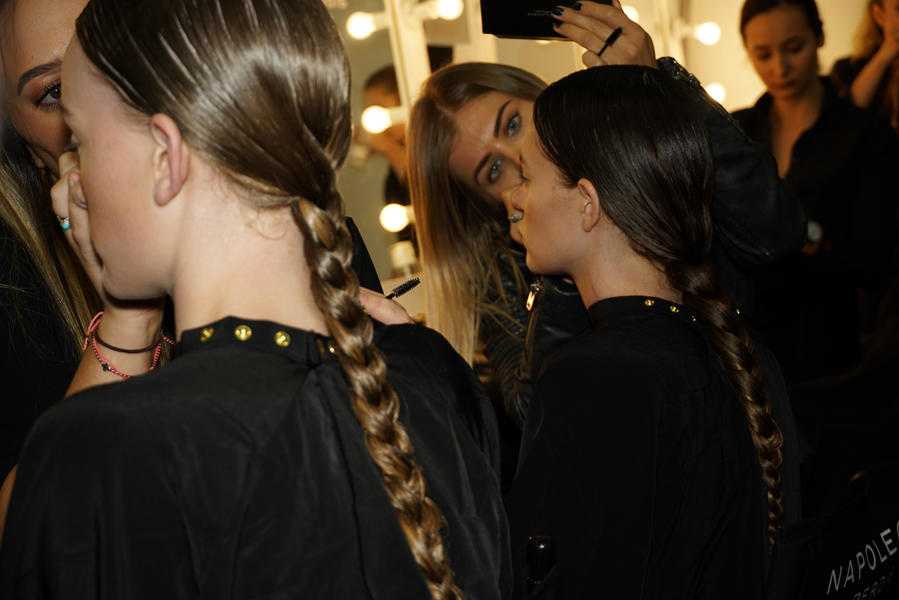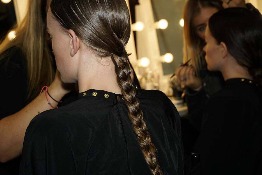 "Pablo and Picasso was the deisigner's vision for the show so we've created two looks with a masculine and feminine vibe for the hair. One of the looks is quite Spanish with a deep centre part, hair tucked behind the ears – we've created texture with the Volume Mousse and Stronghold Gel. We've extended the hair with some human hair extensions and we've created a long braid down the back of the hair to give a local Spanish girl vibe.
