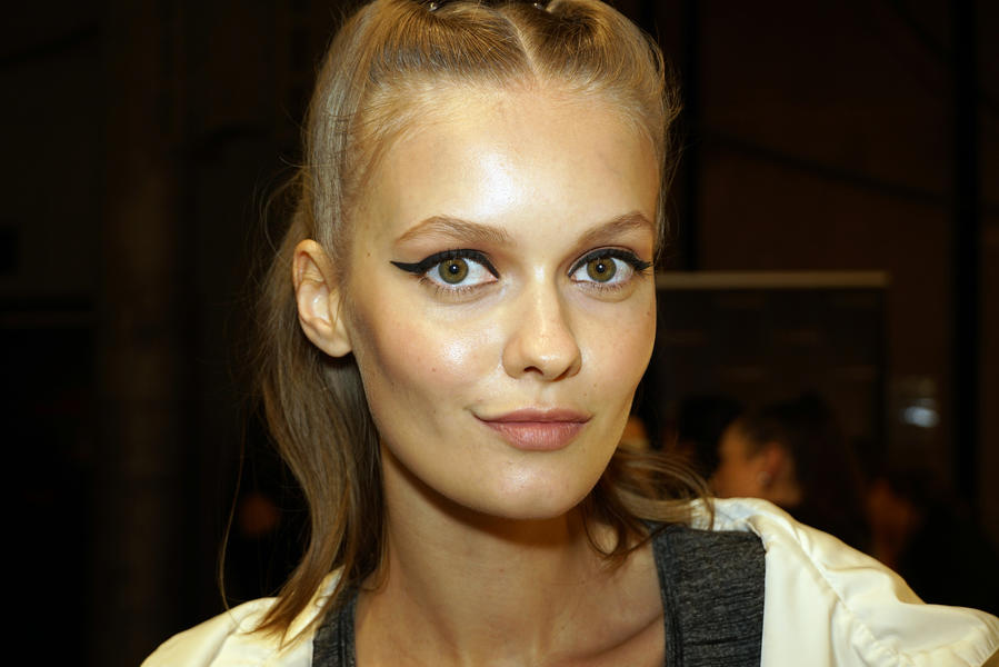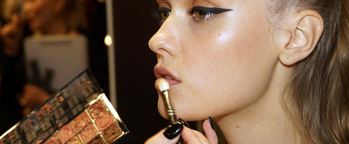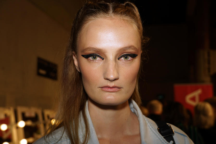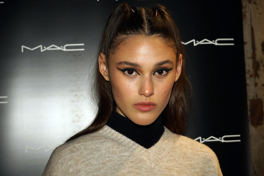 “We're enhancing the eyes with a straight, thick black line on the eyelid – the important part of this is that it's kept super straight. We're using M.A.C Fluidline Eye-Liner Gel in Blacktrack because it's easy to sketch with and it doesn't dry immediately so you have a bit of playtime. We're then going over that with M.A.C Liquid Eyeliner in Boot Black as it's super dark and really matte and will show up against the beautiful luminous skin. The collection is really girly so we love to bring a bit of toughness to the collection so it's not too pretty or prom. This is liner with balls!