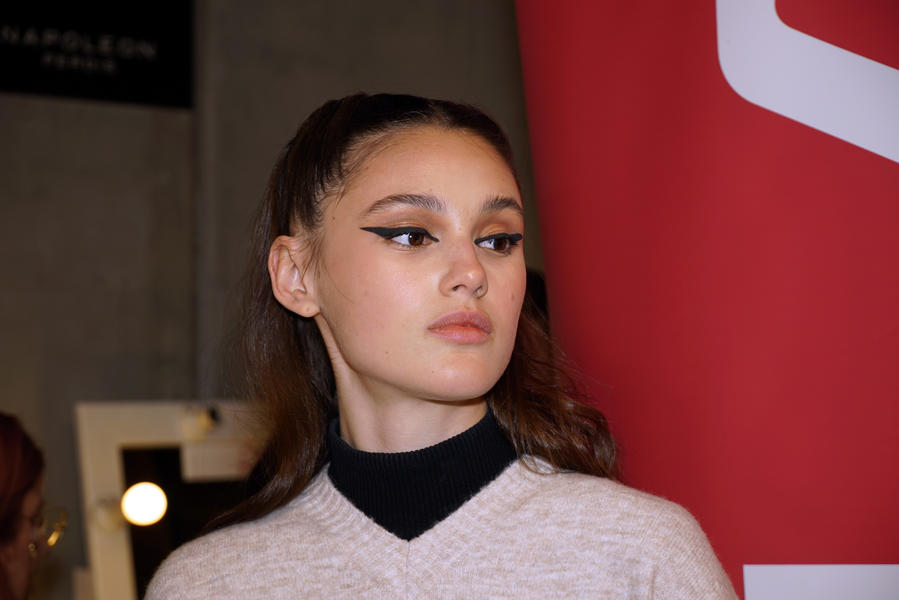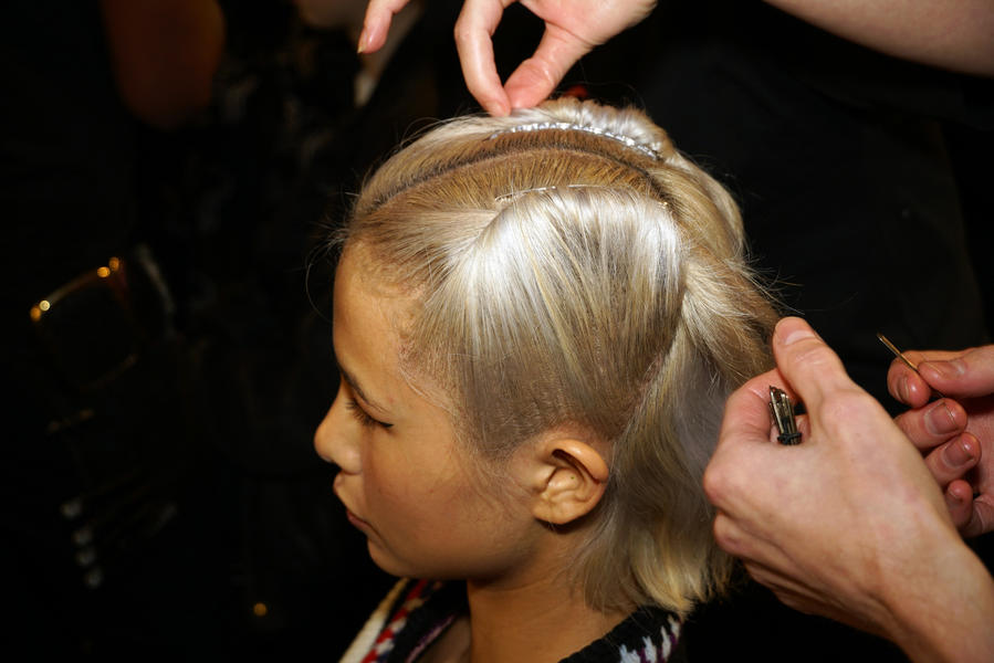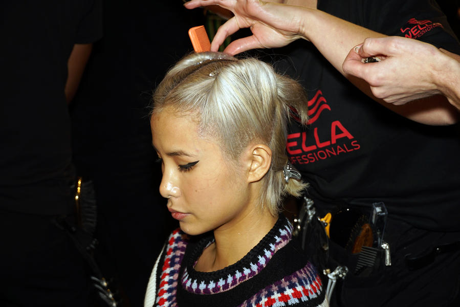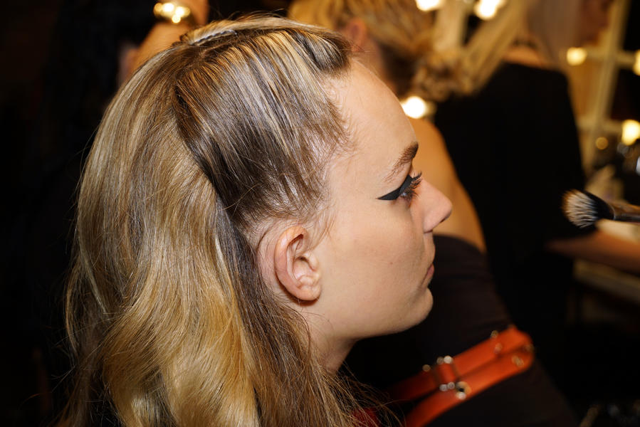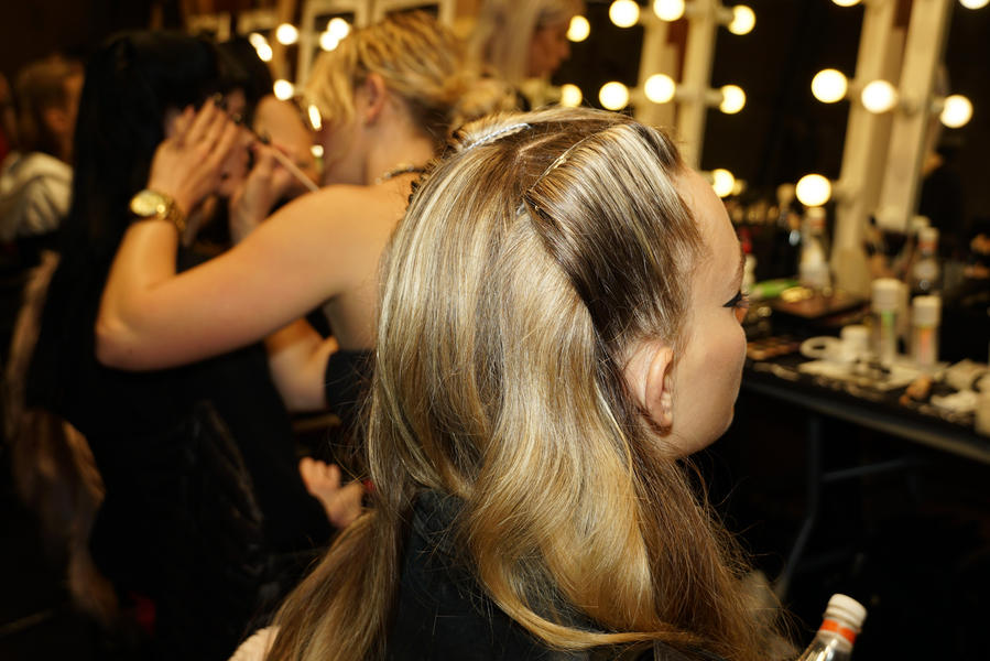 "The look is fierce forties. We're giving each girl a couple of Victory Rolls, there's a parting in the middle and we're pushing the hair back with some Lady Jayne clips. The texture at the back of the hair is quite loose and natural. Most of the girls have a natural shine to the hair but on some we're using an iron and the Wella Professionals Oil Reflections Smoothing Oil. We're the using a bit of Ocean Spritz to achieve a bit of texture at the back of the head and to help with movement down the runway."