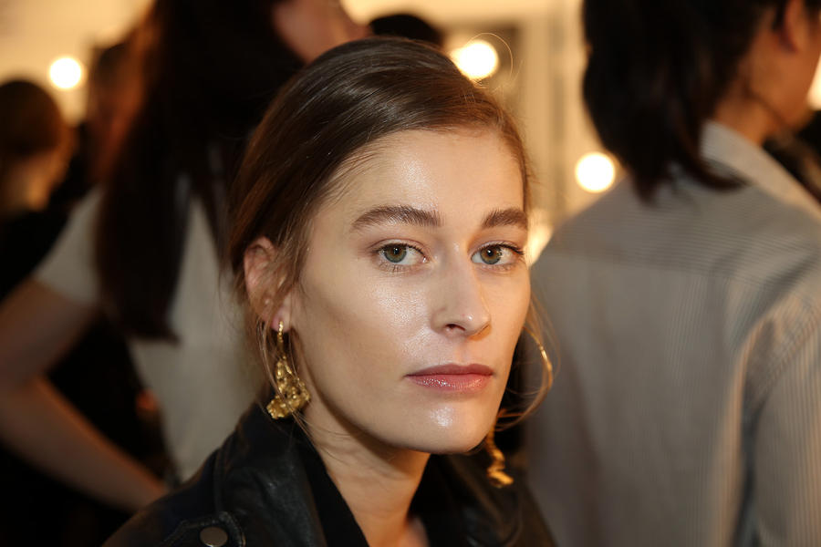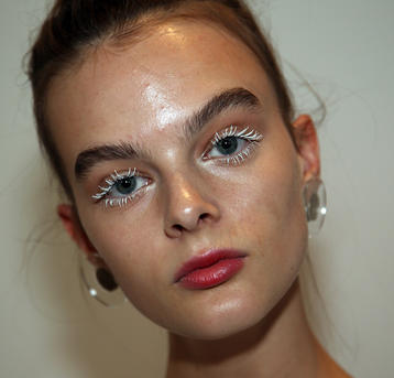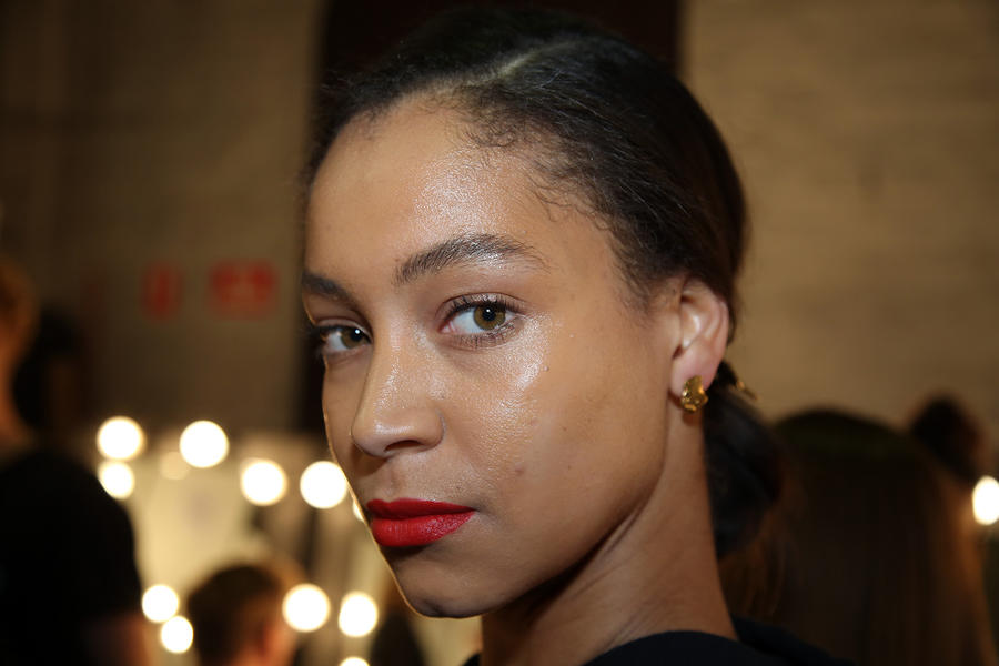 “It’s about dewy everything, and this looks is taking the glowy, wet look to the extreme but keeping a matte lip. Everythings about contrast in Japan, and so with this makeup we’re mixing the traditional with the modernity. So for example we’ve got really gorgeous wet skin, but bushy brows. To create that hyper wet look we’re spraying the models with the shu uemura Skin Perfector Mist right before they step out. It’s a combination of oil and water which when shaken gives you that beautiful glowy look. We started with our Cleansing Oil, and the hero product for this look is the Skin Perfector Oil, you can’t see the oil on the skin but once you put the foundation on it gives the skin a really beautiful natural glow. Second thing we use is our Lightbulb Foundation which is macadamia oil based, this ensures their skin glows under any light. So this is how we’ve achieved a beautiful glowing face without any shimmer or illuminator. For the lip we aren’t using a lipliner, we’re using our 7H brush which has a curved edge that creates a beautiful straight line, and respects the shape of the lips.”
