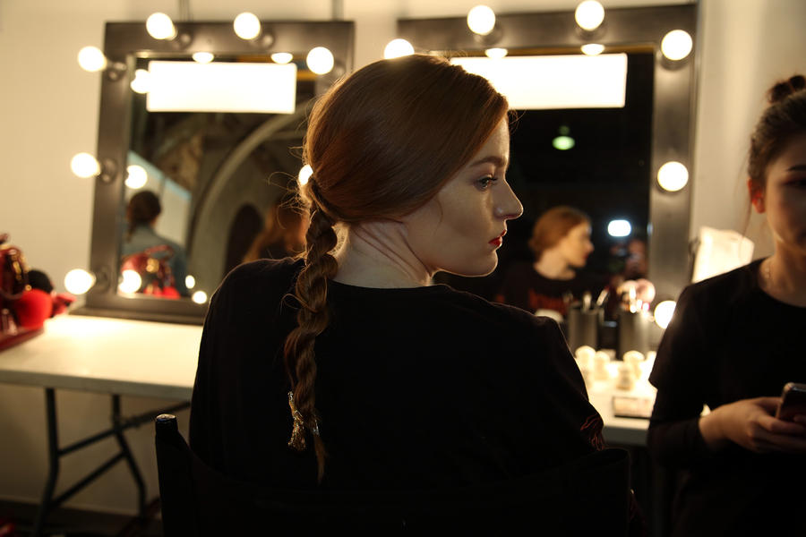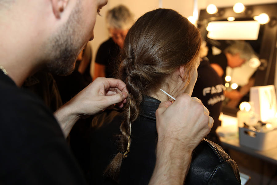 “Anna Quan wanted something to walk down the runway that was effortless but still had a structure to it, just like the garments. She has such beautiful finishes and extra lengths so we’ve tried to emulate that in the hair. Anna has also been collaborating with a hair jewellery designer so all of the looks we’re doing today are being finished with jewellery. Anna wanted to not change the hair of the cool girls who have really cool, natural cuts so we want them to just go down the runway like themselves. For the girls with long hair we’re kind of reverting back to the 90s and doing a top-to-tail braid that’s finished off with a rope braid. To this look we’ve used Kevin Murphy Hair Resort in the hair, and that’s going to get pulled out just before they go on the runway for that really effortless floatiness. Then we’re going to put the jewellery in. For the girls with medium length hair we’re doing the same braid but pulling it back up on itself to give everyone an even look.