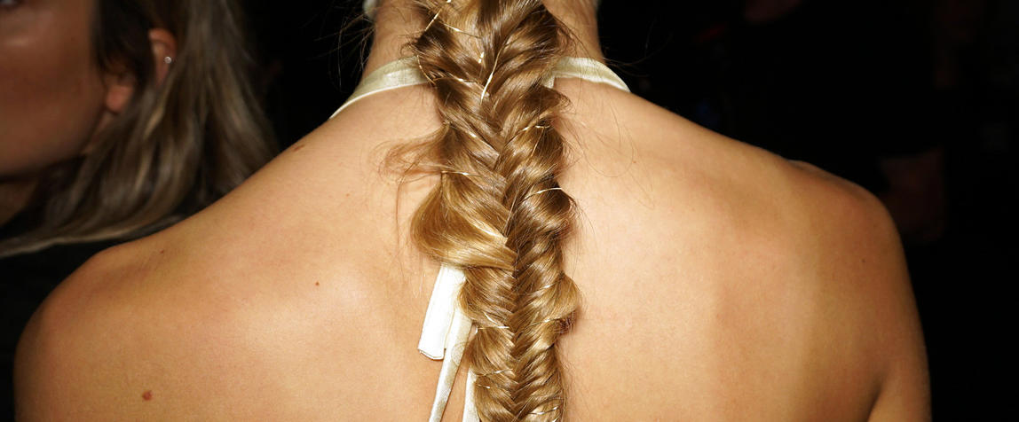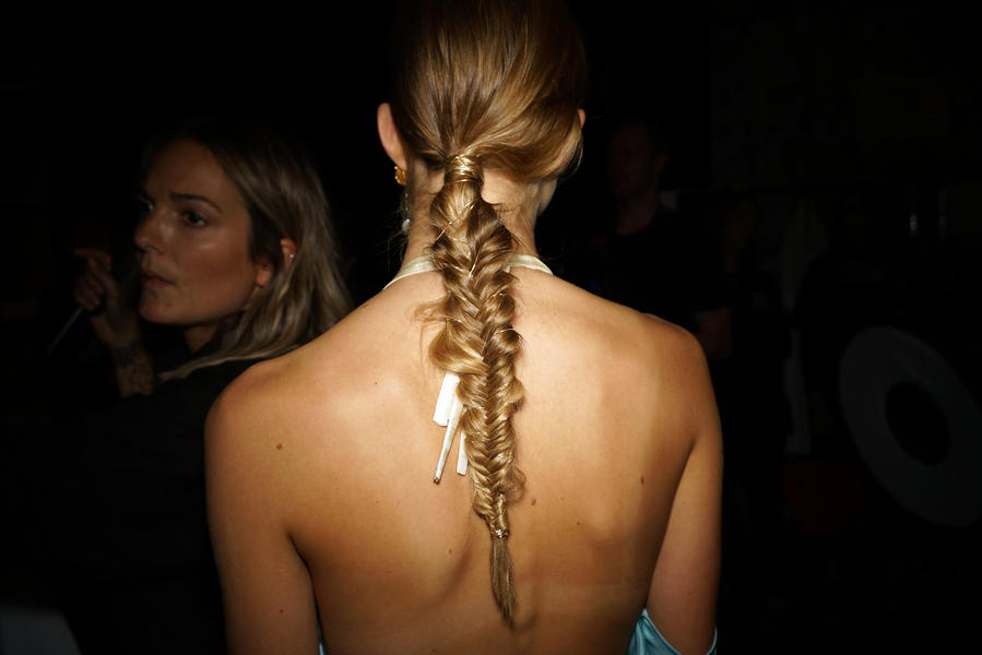 “We are making the resort girl feel more luxe. This Anna Quan girl is either going to be lying by the pool or walking down a runway. Products we’re using are the ANTI.GRAVITY and HAIR.RESORT layered together for some texture with hold; and then putting a finger wave through the hair and brushing it out for a flossiness to the hair. For the longer haired girls we’re doing a fishtail braid with some copper wiring wound through.”