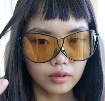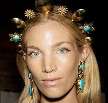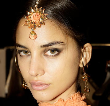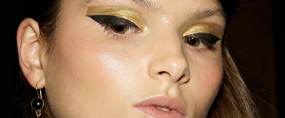 "The makeup look that I've designed for Carla Zampatti this evening is inspired by that sixties/seventies liner look. We've found this Fashion Week there's a lot of eyeliner which is really exciting and fun. Today we've taken a modern approach to the winged eyeliner, a really graphic, architectural line that's quite triangular and edgy. It's then complemented by a really intense gold sweep above. The skin we're keeping really natural. Our signature skin all week has been a combination of the Longwear Foundation with the Absolue Precious Oil underneath and on top to amplify the glow. The lips are pared back and nude. Brows are brushed up and back."