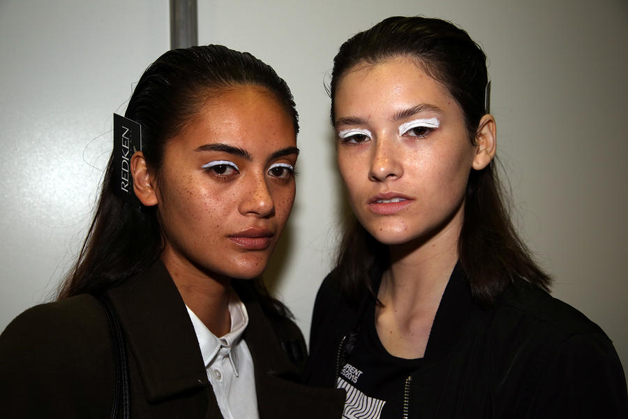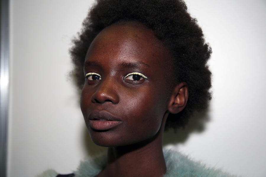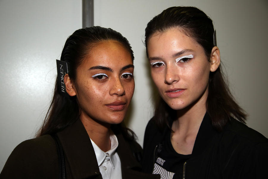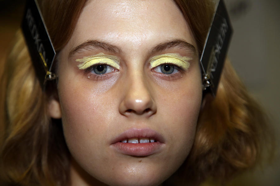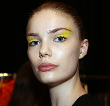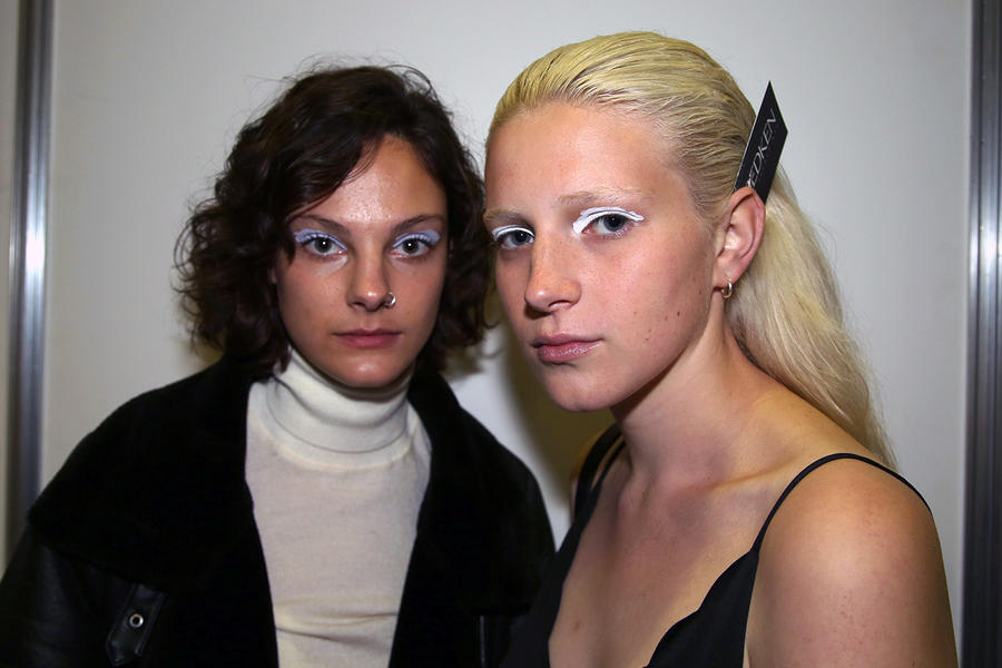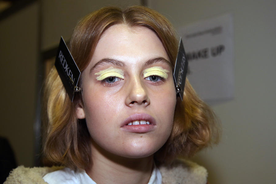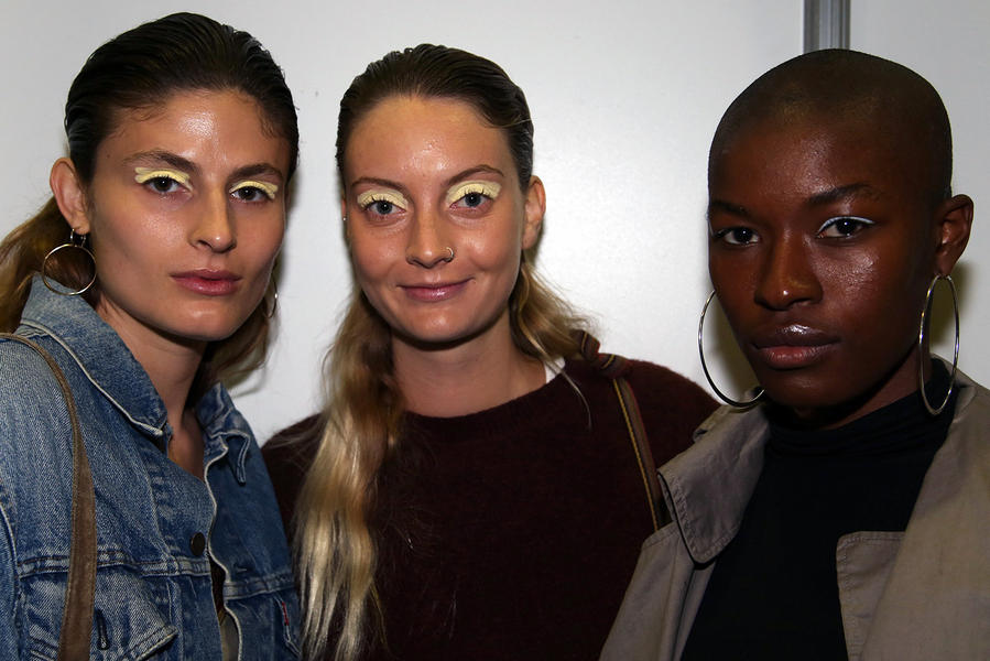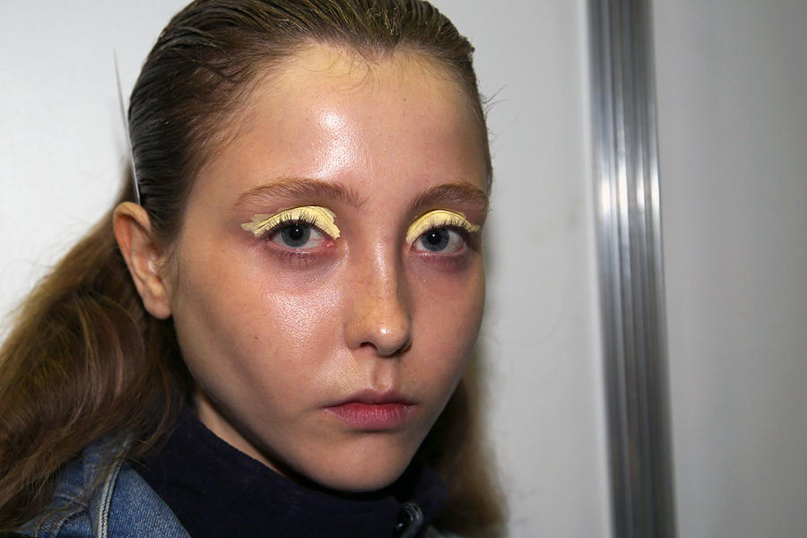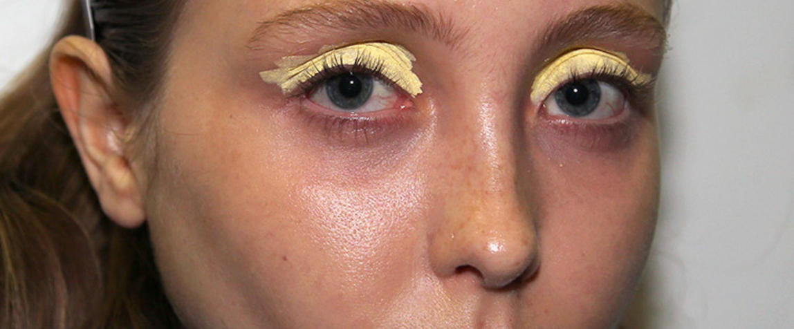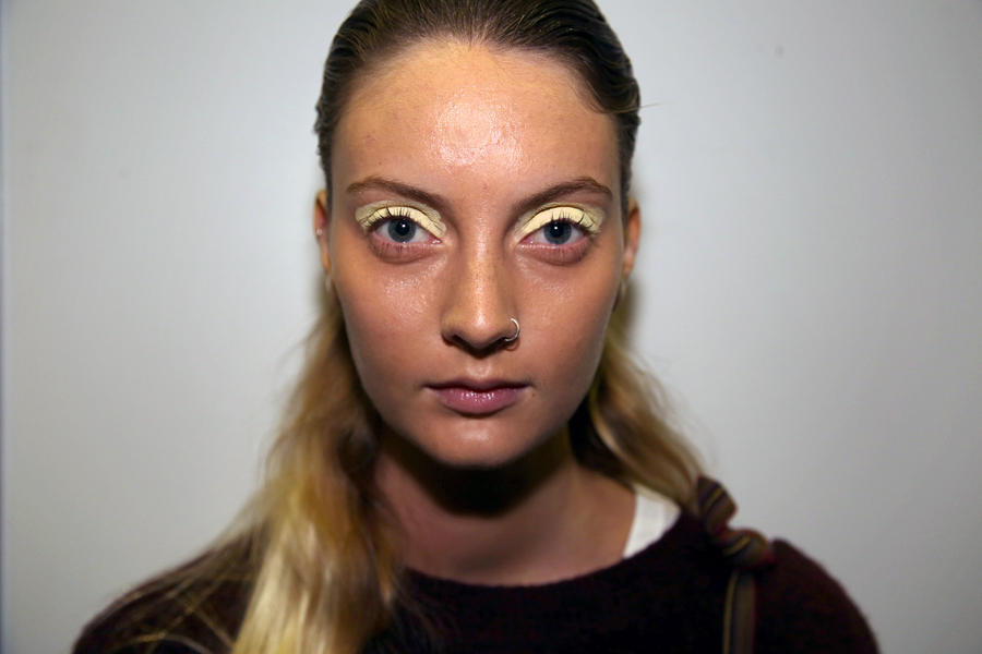 “This season, Christopher’s collection has got a bit more of a feminine edge than it normally does, still quite architectural but there’s a nod to the 80s as well. We’ve taken the latter but given it more of an artistic textural painterly kind of look on the eyelid. We’ve played with the tones from the collection and used either a really stark white, a soft, greyish lilac or a soft lemony yellow. The effect on the eye is artistic because it looks as if we’ve dipped the brush in a pot of paint and swiped it across the eyes. We’ve played to each individual look, so with some of the girls we’ve gone a little bit more full on and intense. Skin is really healthy, fresh and raw; brows are brushed up and a little bit boyish, and then we’ve left the lashes quite clean and just applied a coat of clear mascara. Again with the lip, we’ve kept it looking really fresh and healthy.”