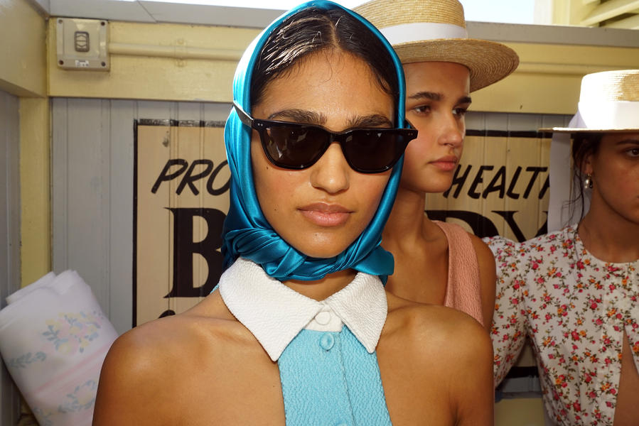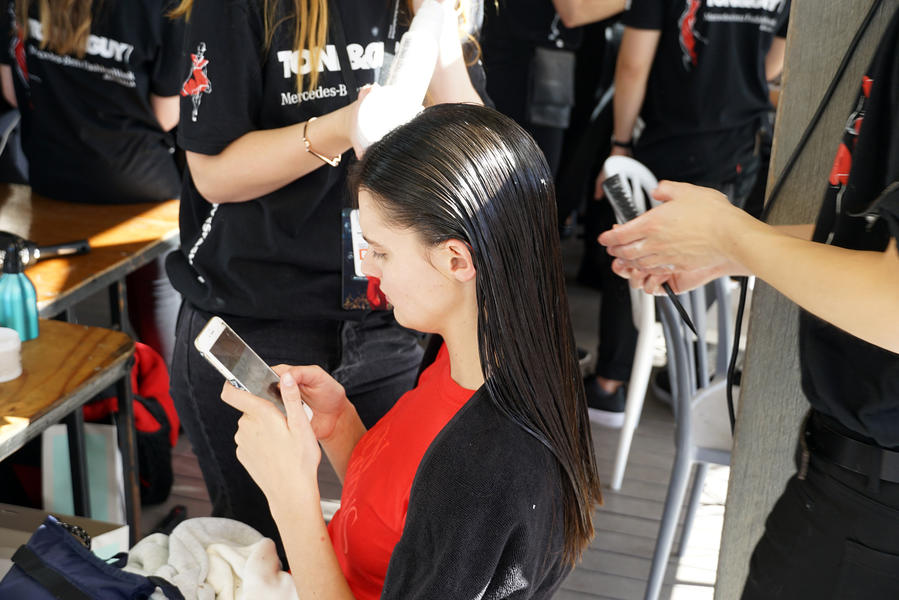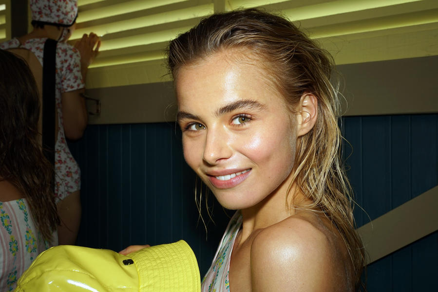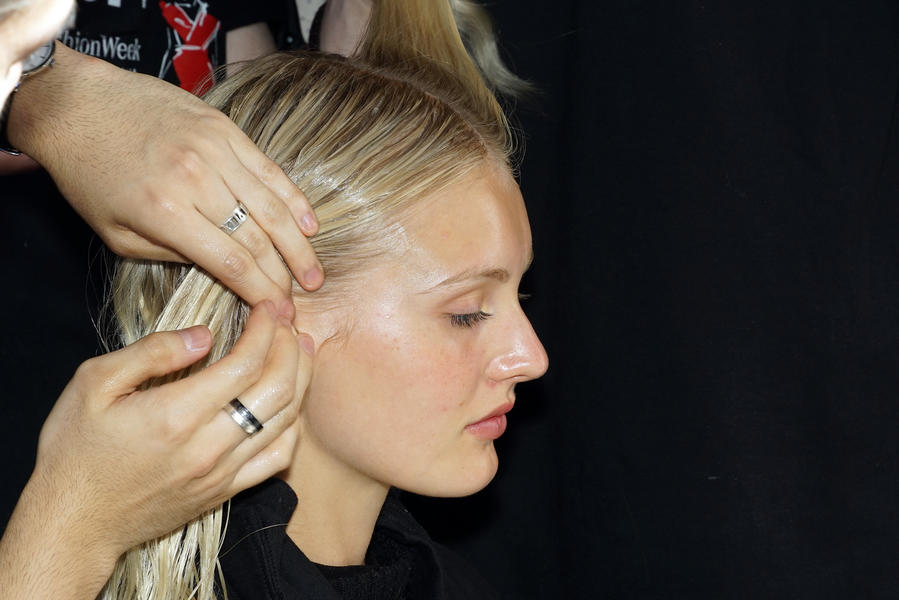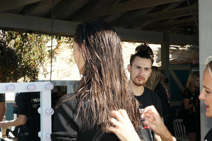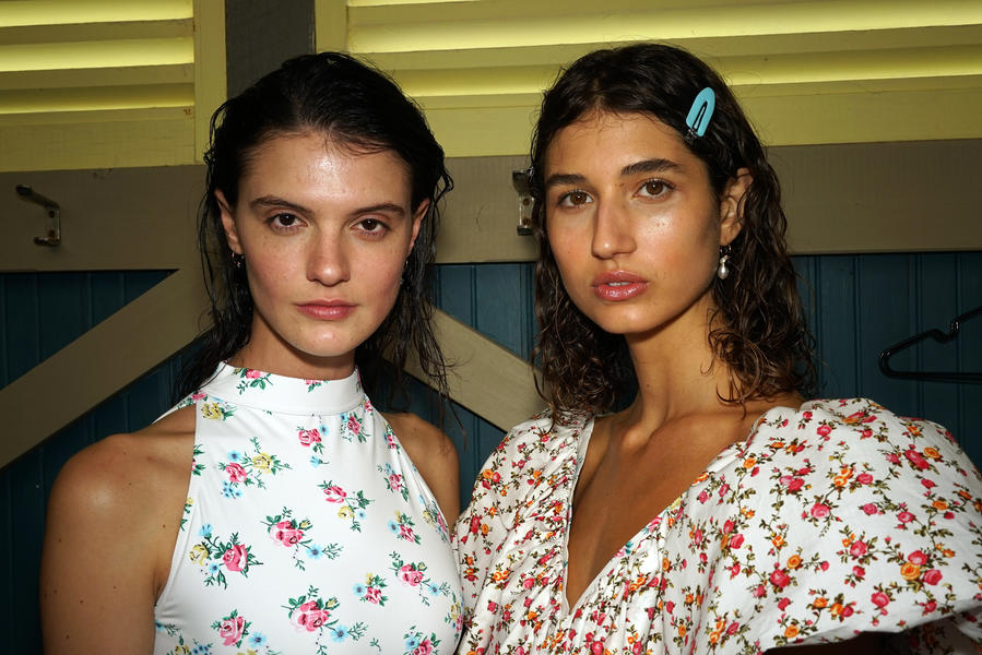 "There's been quite a strong story for the girls today, it's fifties and sixties inspired and the hair is lending itself to the beach, the ocean and the fashion. We were driven by the location of the show and what better excuse to go with a just-out-of-the-pool wet look. For us it was about ensuring we had the right texture, the hair needed to look wet but not be wet. Some of the girls are wearing head wear so it was also about placement, making sure that you can still see the hair despite it being slightly covered.