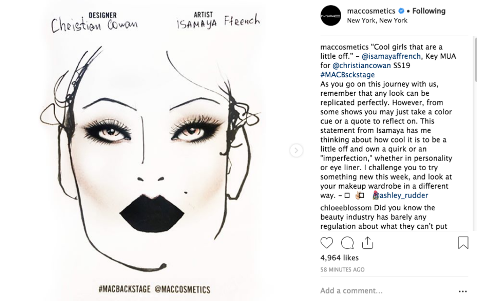 M.A.C dominated NYFW as the makeup sponsor for Chromat, Sies Marjan, Michael Kors, Jeremy Scott, AREA, The Blonds, and more. The makeup giant will inevitably be a firm fixture at other shows over the coming month.