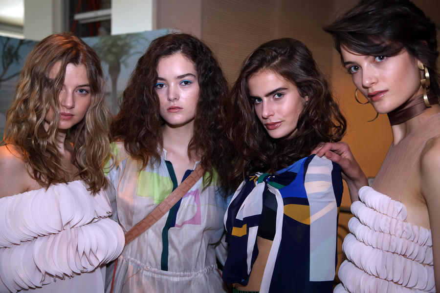 “So we’re doing three looks here today at the Ginger & Smart show. Look number one is a little bit straighter, it still has a strong bend through it but looks really beautiful and polished. Look number two is scrunched curls - kind of wild with a matte finish to the hair and low side parts. The final look is really big, big curls - so we’ve tightly curled the hair into ringlets and then brushed it out. In the foundation work of the hair we’ve used Rootful 06 to create texture, Wind Blown Hairspray and Forceful 23 to finish.”