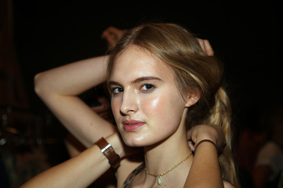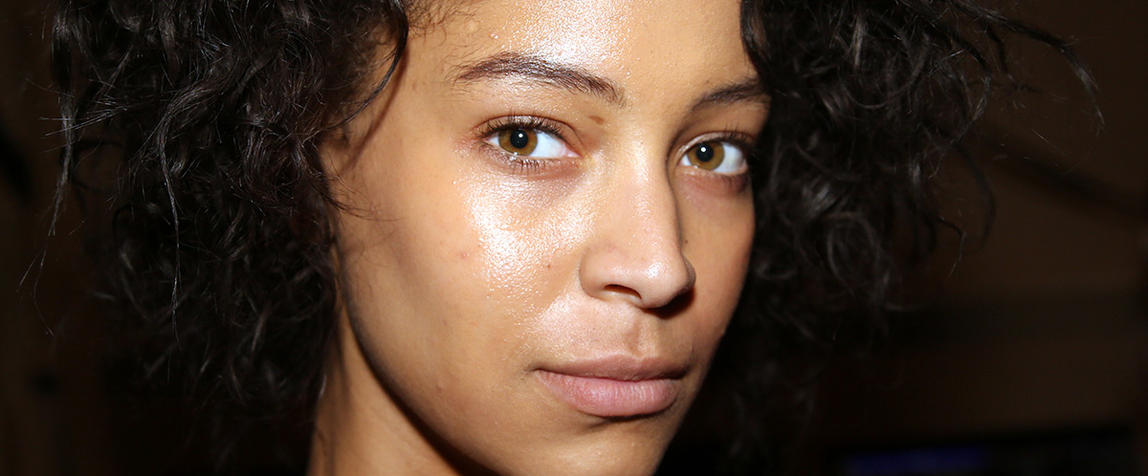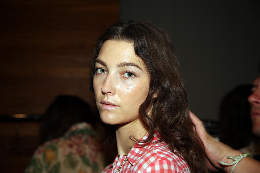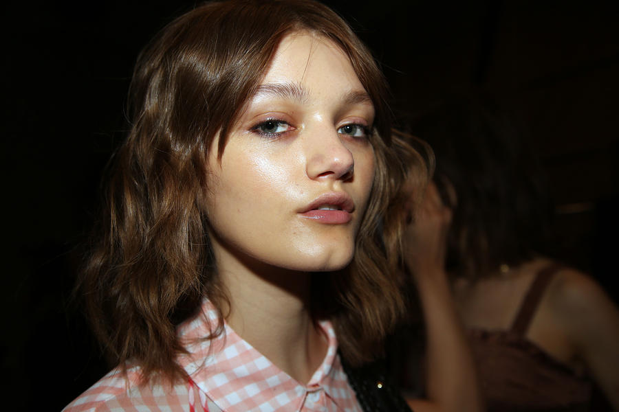 “Hansen & Gretel gave us the brief that they wanted a glowy look but using no illuminator, shimmer or highlighter - but it also couldn’t be matte. So we used our products that give the skin a natural glow; for example, we started with our Cleansing Oil because as Mr. Shu Uemura once said ‘Beautiful makeup starts with beautiful skin.’ It’s all about enhancing the girl's features and covering the imperfections. The hero product for this look is the Skin Perfector Oil, you can’t see the oil on the skin but once you put the foundation on it gives the skin a really beautiful natural glow. Second thing we use is our Lightbulb Foundation which is macadamia oil based, this ensures their skin glows under any light. So this is how we’ve achieved a beautiful glowing face without any shimmer or illuminator. We used a lipstick on the cheek to continue creating that wet look - our Rouge Unlimited Lipstick. On the lip it’s purely just our lip balm to give that hydration and the white lining over the lip to finish the look.”
