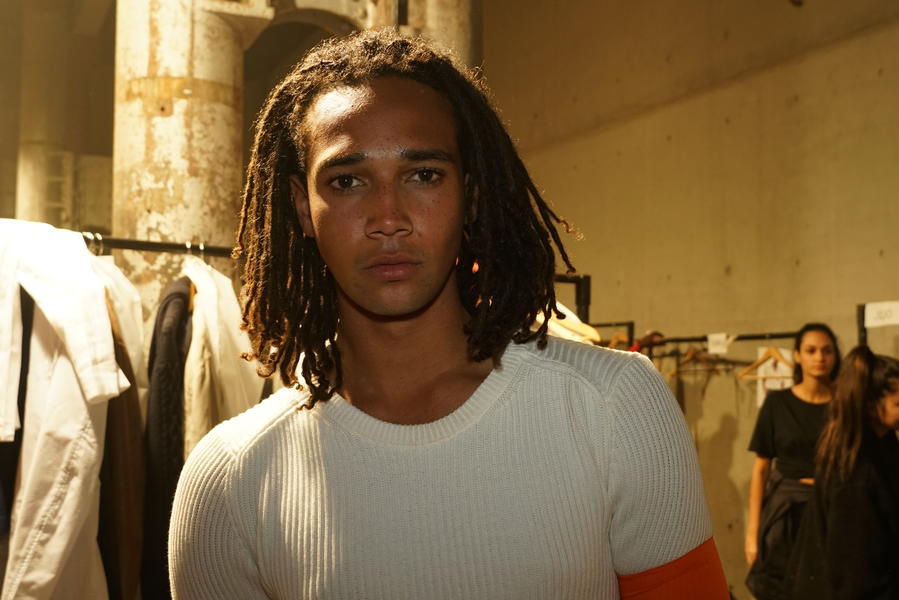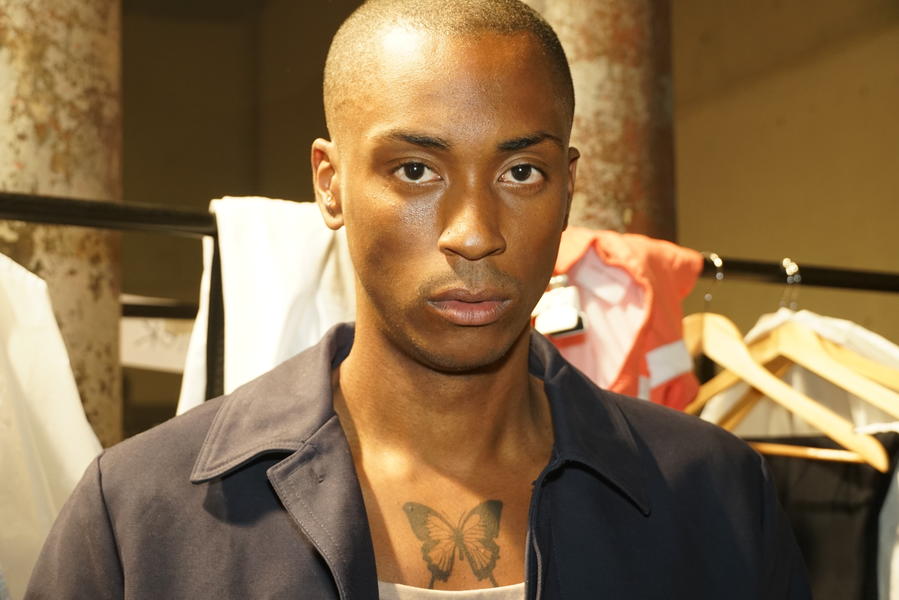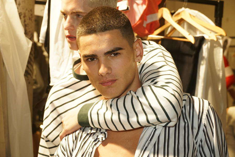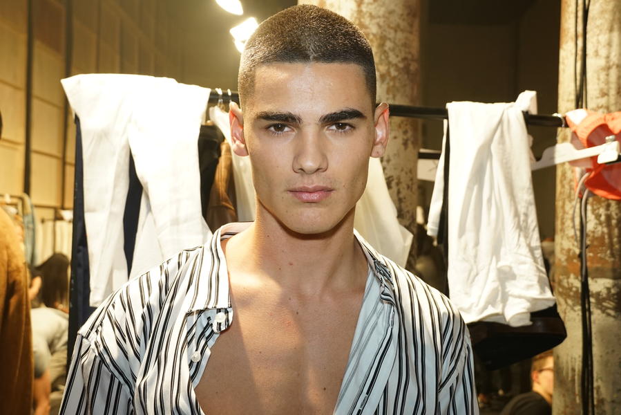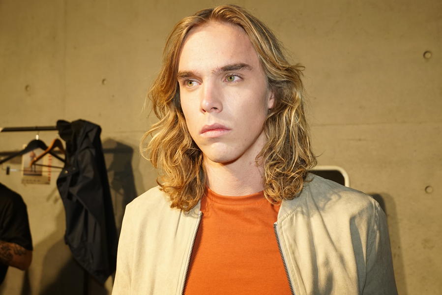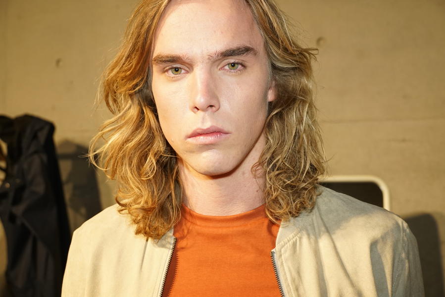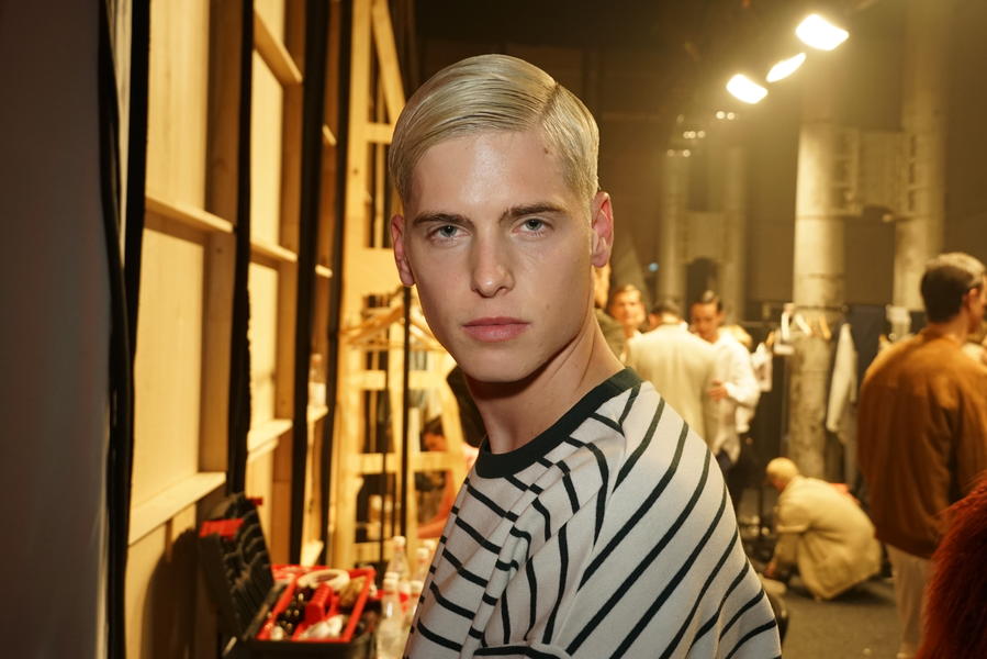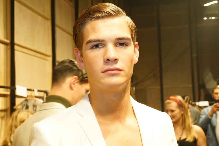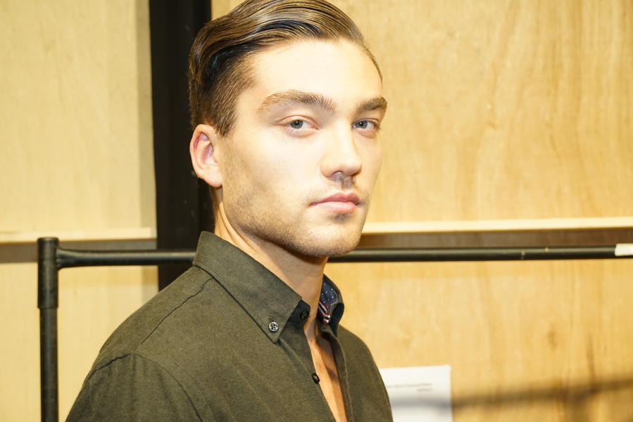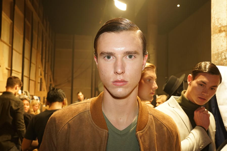 "We had two hero models that were driving their own look. So Josh kept his natural hair but we used the Redken Brews range to work with his style. Then we has Christian who had a male ponytail which was really cool to send down the runway because I don't think we've seen that yet this week. The rest of the boys were highly groomed and had a really defined syle using the new Redken Brews that we mixed with a gel and blow-dried in. We finished the look with a high shine using the new Wax Pomade and Brews hairspray. We basically wanted them to look like mannequins walking down the runway."