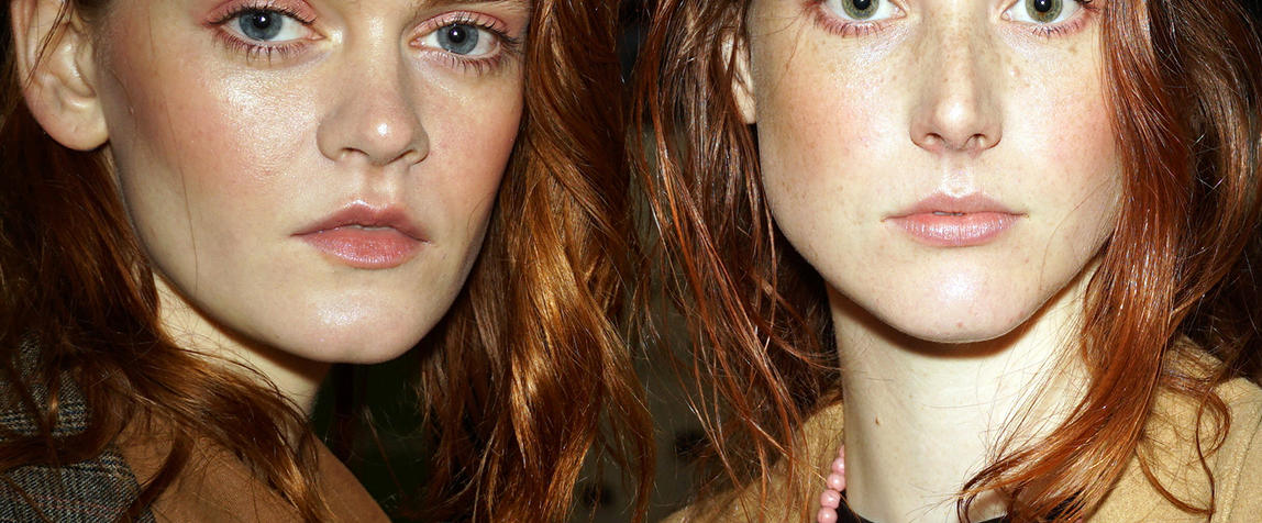 On the lips we're mixing two shades from the Smith & Cult Shining Lip Lacquer range: Milk for Hunny and Marriage No.2. The combination of the shades gives a hint of colour that's really soft and matches the cheeks. Eyebrows are simply gently brushed."