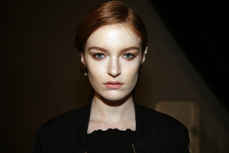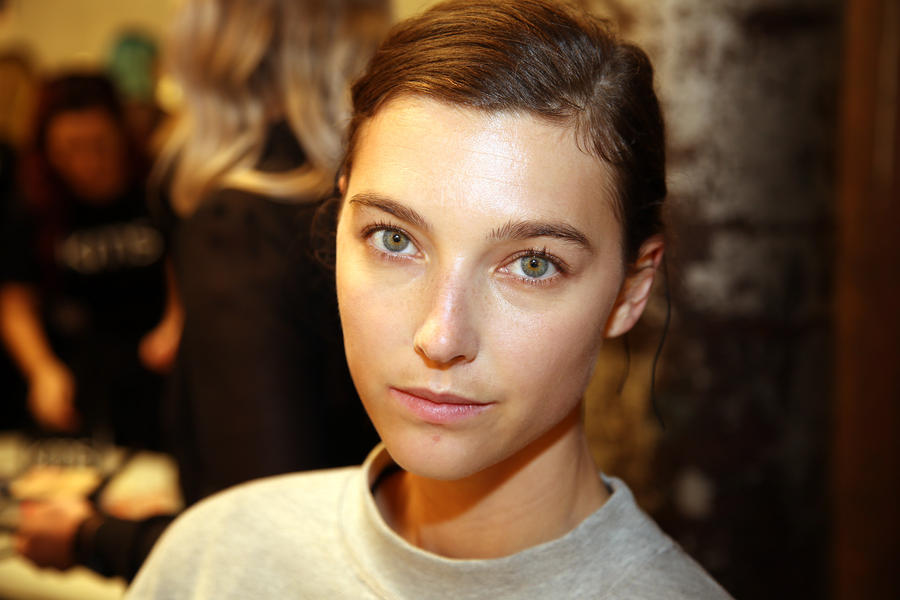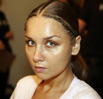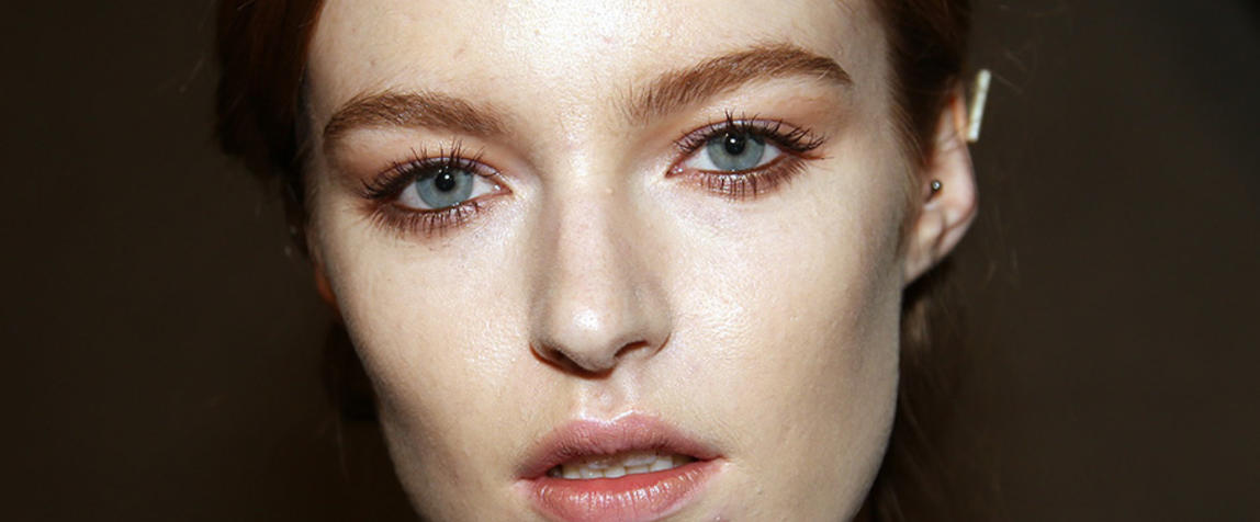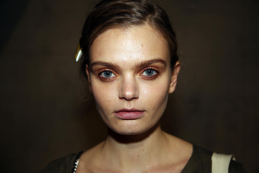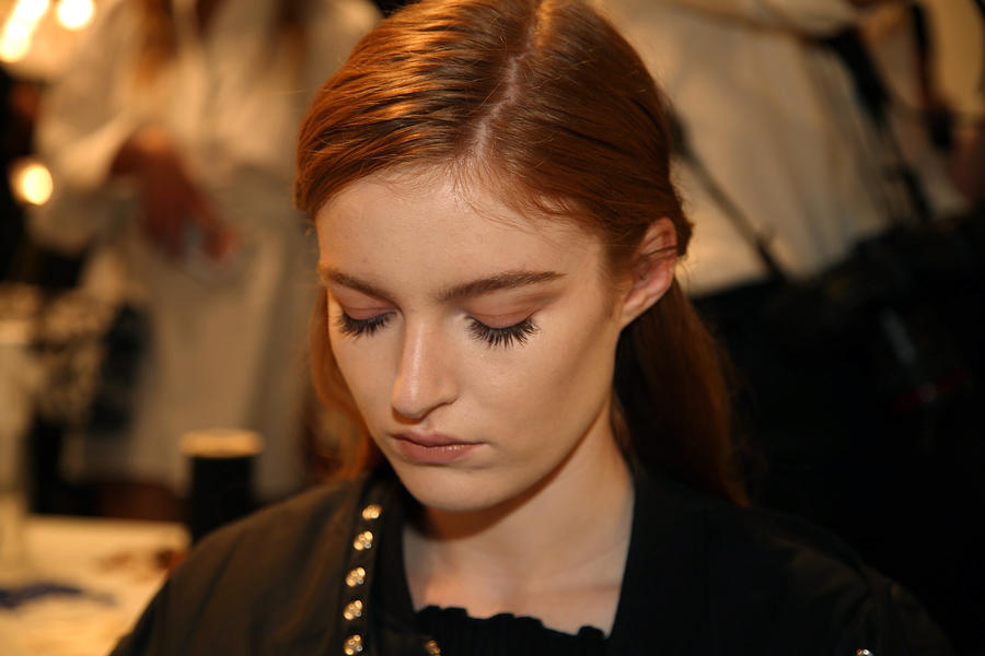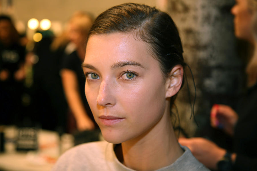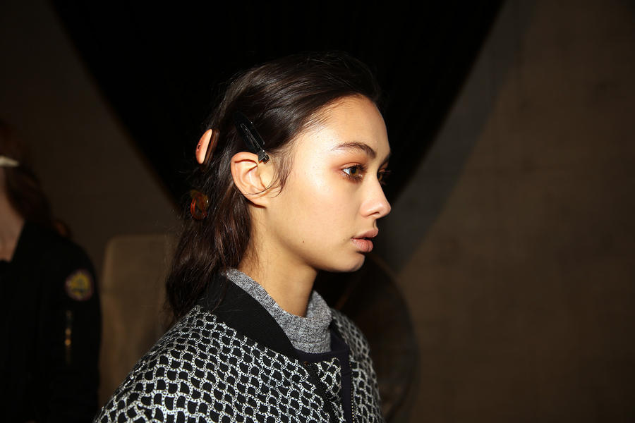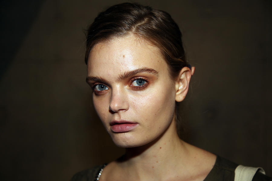 “I really wanted to do translucent matte skin which is probably the trickiest makeup to do. The reason we’ve gone for this is because Kit wants the girls to look super earthy - it’s not luxe, it’s just not that kind of show. On the skin, it’s all about creating natural skin with the least amount of products. We’ve massaged in M.A.C Mineralize Charged Water Skin Hydrating Mist and a little bit of oil to specific areas of the face that look quite dry, then we apply the M.A.C Prep + Prime Moisture Infusion. We’re trying to avoid foundation today but we’ve used the M.A.C Studio Finish Concealer that’s applied with a sponge and then we add the M.A.C Invisible Set Powder with a small brush - I really like how smoothing this product is. We’re not packing it on, rather spreading it out. In terms of the eye, we’ve used M.A.C Haute & Naughty Mascara in Brown which is nice and earthy and we’ve made it quite heavy against the clean skin. Then we’ve used the M.A.C Cream Color Base in Dusk which is a lovely rich colour, and on top of that we’ve used a creamy, nude lip stain which creates a glossy lid. Note - if you matte everything around a glossy moment, it makes the the gloss stand out without having to add more. Next we’ve applied M.A.C Yash Lipstick which counteracts the natural pink in the lips - this is dabbed on very lightly. For brows we’ve used a brow palette, we’ve wet the colours because we want strong but fluffy brows that evoke that tribal look. A dark charcoal colour is applied to create a bit of definition and body - this needs to be done fast so it doesn't look too polished.”